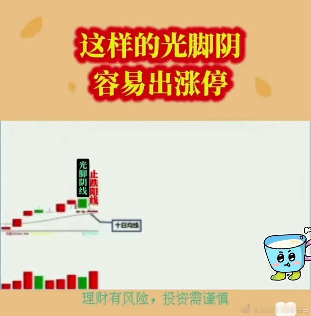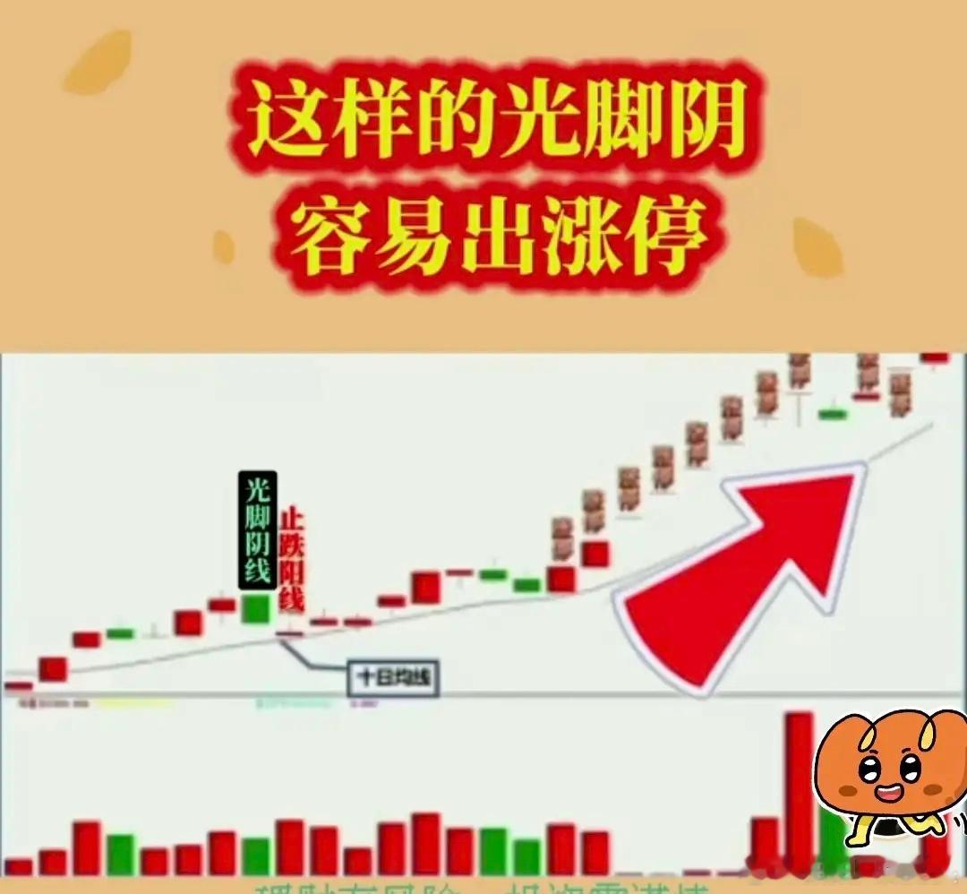 这样的光脚阴 抓到就是连涨模式条件如下:①上涨趋势中,不好辨别是否上涨趋势的,就看k线是否多头排列即可②某天来了一个光脚阴线。即是收在最低价,最好是光头光脚③次日收止跌阳线④光脚阴和止跌阳都没有跌破10日均线⑤止损位为止跌阳最低价