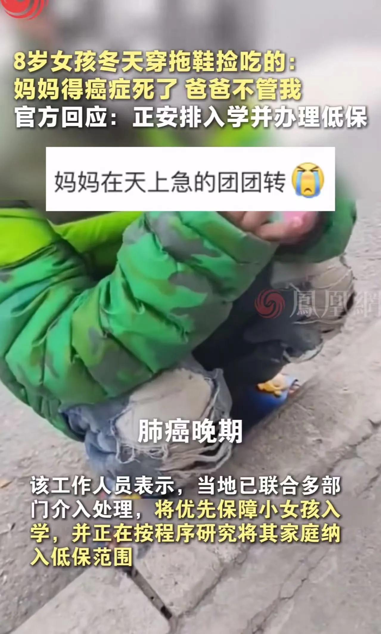 看的人眼泪直流!陕西西安,8 岁女孩冬天只穿一双拖鞋,在路上捡吃的!一位女子看到后,问她妈妈呢?没想到女孩说:“妈妈得癌症死了,爸爸不管我……”网友:真是没妈的孩子是根草啊!她妈妈在天上肯定急得团团转 背后令人心碎的真相让人震撼 情绪激烈,画面震撼 那天,寒风刺骨,西安的街头依旧车水马龙,却在一个不起眼的角落,发生了一幕令人心碎的画面。一名8岁的女孩,只穿着单薄的衣服和一双拖鞋,蹲在路边,低头捡拾着什么。她的身影在寒风中瑟瑟发抖,脸上的稚嫩却透露出一种令人心碎的坚强。 当一位路过的女子看到这一幕,忍不住走上前问:“小朋友,你的妈妈呢?”女孩抬起头,用那双清澈又带着无助的眼睛回答:“妈妈得癌症死了,爸爸不管我……”一句话如同重锤,击碎了所有人的心。 深度挖掘背后人性与社会问题 一、令人心碎的真实故事:一个孤儿的坚强 这个年仅8岁的女孩,没有母亲的陪伴,没有父亲的关爱,却依然在寒冬中坚持生存。她的故事,是无数孤儿的缩影。在这个快节奏的社会,家庭的破碎、父母的疾病、贫困的阴影,像无形的枷锁,困扰着许多家庭。 二、社会的责任:我们能做些什么? 面对这样的悲剧,许多网友纷纷表达了愤怒与心疼。有的人呼吁社会给予更多关注和帮助,有的则反思:我们的社会是否为这些弱势群体提供了足够的保护和关爱?我们每个人是否也能伸出援手,给予他们一丝温暖? 三、矛盾冲突:温暖与冷漠的较量 有人说:“这只是个悲剧故事,谁都无法改变。”也有人坚信:“只要我们每个人都多一份关心,就能改变他们的命运。”这两种声音,代表了社会的两极:冷漠与温暖的较量。 四、温度:人性中的善与恶 在这个故事中,女孩的坚强令人动容,但也暴露出社会的冷漠。有人愿意伸出援手,也有人选择视而不见。这场冲突,折射出人性中善与恶的较量,也让我们反思:我们能为这些孩子做些什么? 五、态度:我们应持何种立场? 作为社会的一员,我们应当以何种态度面对这些悲剧?是选择漠不关心,还是积极行动?答案或许在于每个人的心中。我们可以从身边的小事做起,为弱势群体带去一点温暖。 引发共鸣,激发评论 这个8岁的女孩用她的坚强和无助,撼动了无数网友的心。她的故事像一面镜子,映照出社会的温暖与冷漠,也让我们每个人都陷入深思:我们能为这些“没妈的孩子”做些什么?他们的未来,究竟由谁来守护? 各位网友,你们怎么看?是该继续冷漠,还是伸出援手?你的每一句评论,都是对这些孩子最温暖的回应。快在评论区留言,让我们一起为他们发声吧!