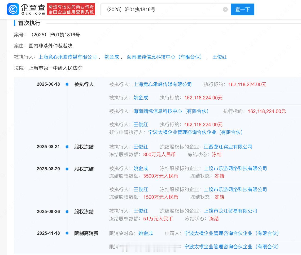 【】企查查APP显示,近日,RNG老板姚金成因未履行生效法律文书确定的给付义务,被采取限制消费措施,申请人为虎牙旗下宁波太横企业管理咨询合伙企业(有限合伙),涉及国内非涉外仲裁裁决一案。此前,姚金成、上海竞心承峰传媒有限公司等已因此案被强制执行1.6亿,姚金成所持RNG(上饶市乐游网络科技有限公司)3500万股权被冻结。