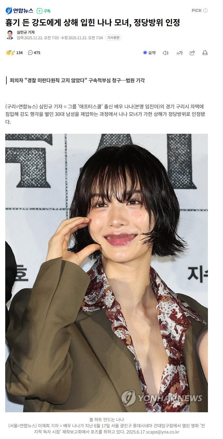 【韩国艺人Nana母女家中勇斗持刀劫匪,警方认定行为属正当防卫】 出身于组合"After School"的演员Nana位于京畿道九里市的住宅遭入侵,在制服实施抢劫的30多岁男性的过程中,Nana母女造成该男子受伤的行为被认定为正当防卫。九里警察署于22日表示,将以特殊抢劫伤害嫌疑,在24日将已被逮捕的30多岁男性A某移送检方并申请逮捕令。本案中,人们关注的重点在于Nana母女在制服A某过程中造成其受伤的法律性质,即是否认定为正当防卫。据警方透露,当时A某持凶器闯入住宅,为阻止其行为,Nana及其母亲与其发生了肢体冲突。在此过程中,A某因凶器导致下巴部位受到撕裂伤。警方基于受害者及嫌疑人的陈述等,审查了该行为是否符合《刑法》第21条第1项的正当防卫。该条款规定,为防卫自己或他人的法益免受"当前的不当侵害"而采取的行为,若存在"相当理由"则可成立。警方相关人士说明道:"调查确认受害者们遭受了实质性的侵害,且在防卫过程中并未对嫌疑人造成严重伤害。综合判断后,认为受害者们的行为属于正当防卫,因此未对其立案。"此外,A某在被逮捕两天后的18日,以"逮捕过程中警方未告知米兰达原则"为由,申请了逮捕妥当性审查,但法院驳回了其申请。由于申请了逮捕妥当性审查,逮捕期限也随之延长,警方计划于24日将A某移送检方并申请逮捕令。此前,A某涉嫌于本月15日上午6时许,持凶器闯入位于九里市峨川洞的Nana家中,威胁Nana母女并施加伤害,索要钱财。据调查,他是利用事先准备的梯子爬上阳台后,通过未上锁的门侵入室内的。据悉,体型相对矮小的A某在屋内发现Nana的母亲后,对其进行了掐脖子等伤害行为。随后,听到母亲尖叫声醒来的Nana上前阻止,母女二人最终在与A某的搏斗中抓住其手臂使其无法动弹,并报警。Nana所属社方面表示,母亲在制服歹徒的过程中受伤,在接受治疗后恢复了意识,Nana也因受伤接受了治疗。警方表示,A某无业,据信并非所谓的"私生饭"或针对特定艺人家中作案。受害者也陈述称与A某素不相识。A某在警方调查中陈述称:"我以为家里没人。不知道是艺人居住的地方,因为生活费不足而犯案。"