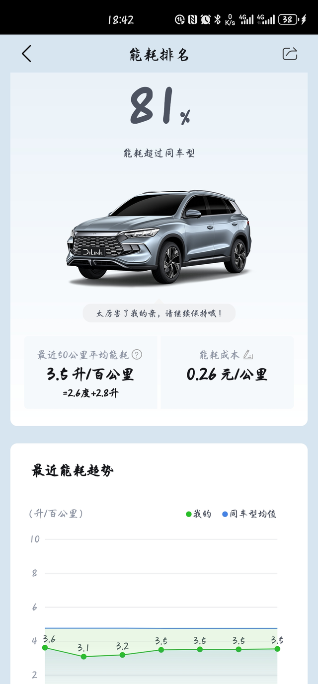 宋pro初上高速新体验 今天回老家,第一次上高速,在这里总结下对宋大妈的新体验吧。 第一点就是省油,是真的好省😂。全程一共三百三公里左右,这是在出发时拍的照片,有55%的油和95的电,全程高速里程大概三百公里(路上堵车堵了三个多小时😅)。然后开的hev和eco模式,设置智能保电70%(基本上能保电在70上下浮动)。不堵车的路段开智能领航,速度在80-120之间(定速巡航100左右的时候感觉最省)。到家后发现还有50%的电和30%的油,算了下大概耗电9度耗油13 升。 第二点就是acc还挺好用的,尤其是对于新手来说,我全程几乎都开了acc,最低堵车时几公里每小时到最高120公里每小时,宋pro的自适应巡航都能很好的辅助了我,拯救了我的右腿和肩膀(即便如此肩膀还是很酸,毕竟还是得扶着方向盘,不可全部依赖辅助),然后也没有网上所说的画龙,基本上是很稳的。 第三点说个缺点吧,就是速度到了120后感觉发动机声音就有点大了,不过提速确实很快。