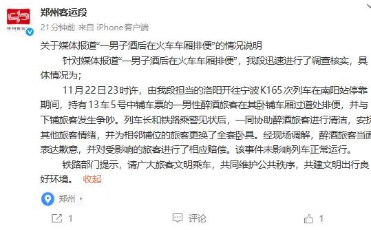 俗话说,人有三急,但在火车车厢内排便的还是第一次听说,就连工作了30年的列车长,也是第一次碰见。 11月23日凌晨,河南南阳,有网友发视频称,在洛阳开往宁波的K165次列车,在南阳站停靠期间,13车厢5号中铺的一名男子醉酒男子,在过道上排大便,还污染了下铺乘客的鞋子和物品。 根据视频显示,当时很多乘客都已经休息了,车厢内的灯也熄了,一般情况下,根本看不见。下铺乘客发现后,非常生气,就与其发生了争吵。 随后,列车长和乘务人员,协助醉酒男子清理了排便物,并给邻座的旅客更换了全套卧具,还进行了情绪安抚。有目击者表示,事发位置就在卫生间旁边,大概就几步路。 最后,醉酒的男子当面对受影响的旅客道了歉还进行了赔偿。据列车长说,他工作了30年了,还是第一次碰到这样的事。 对此,11月24日,郑州客运段发布了情况说明,表示确实有此事,但该事并没有影响列车的正常运行,并提醒大家文明出行。 可以说,该男子的行为非常恶劣,不但丢人,还影响整个车厢的环境,给其他旅客带来了非常不好的体验。要知道,火车上整个车厢几乎是封闭的,男子的这种行为,会使整个车厢臭气熊天,对于有洁癖的人,可能会受不住。 总之,出门在外素质是自己给的,好的环境也是大家一起营造的。如果所有乘客都像这位男子一样,那场面简直无法想象。