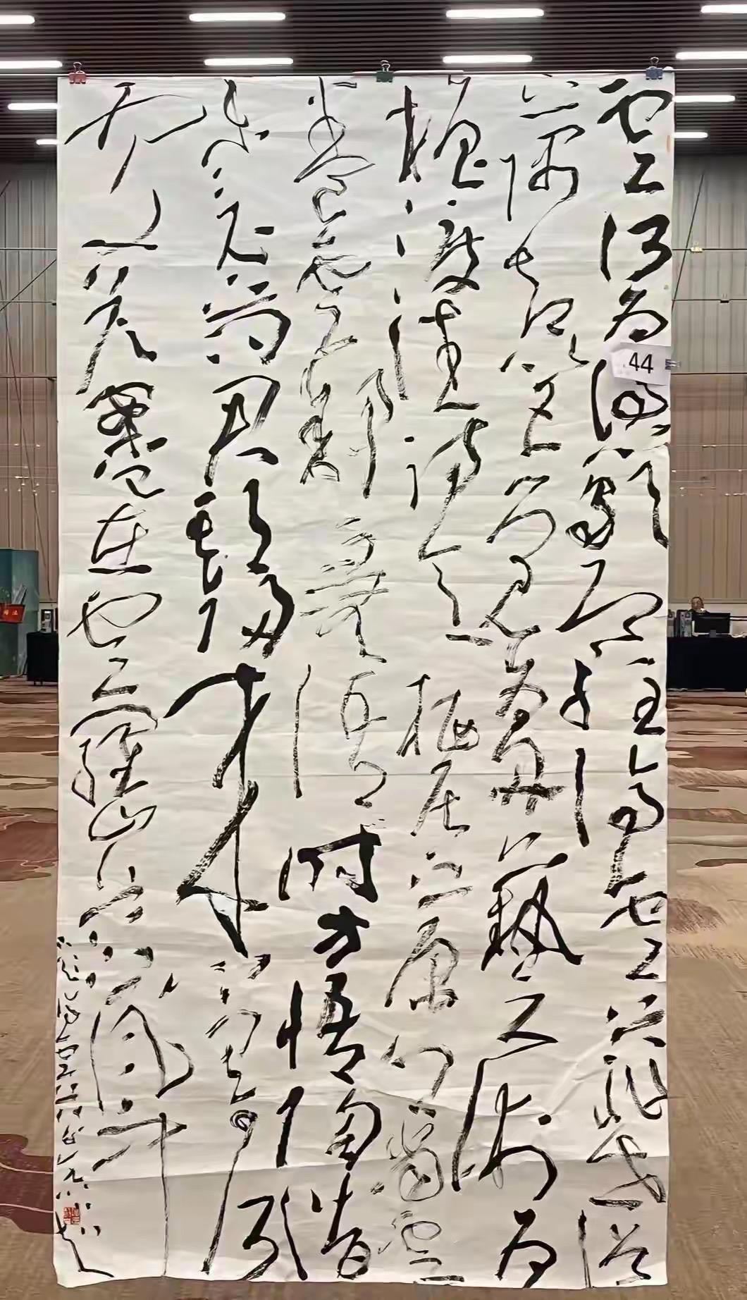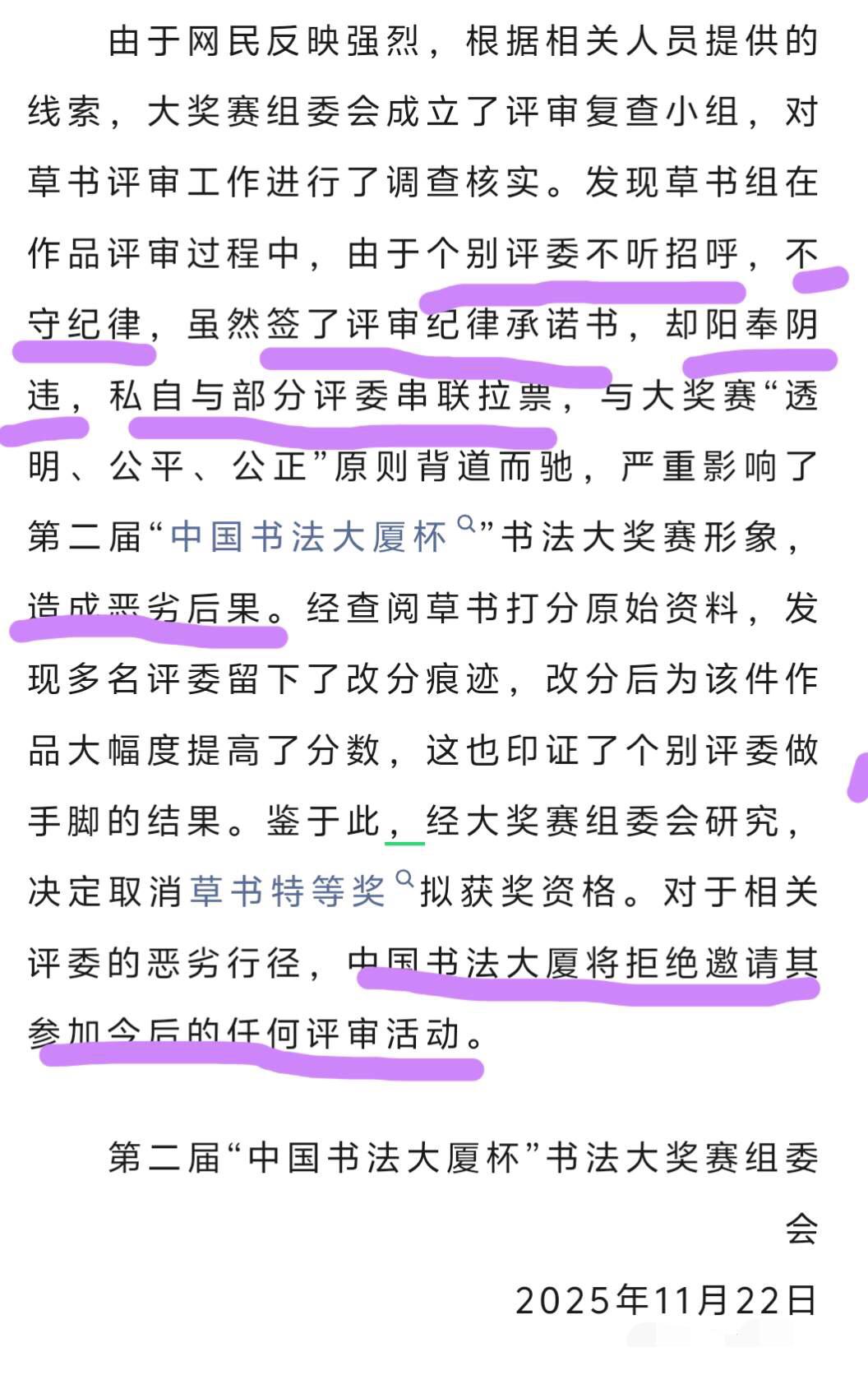 毛笔界大丑闻!中国书法大赛惊爆评委作弊!多名评委暗箱串分实锤!草书奖遭取消! 第二届中国书法大厦杯草书组终评在11月13日举行,当天延志超的44号作品以96.44分获评草书特等奖并公示,公示期为11月13日 - 19日。但11月22日组委会发布公告取消该奖项。 取消起因是44号作品在40进6阶段仅排第6,成绩平平,可到终评时却突然飙升至96.44分拿下特等奖,这种前后反差极不正常,而且评委打分差异悬殊,由此引发网友强烈质疑。 另外,很多网友认为44号作品不符合草书特等奖水准。笔墨缠绕如乱麻,字与字黏连得难以区分,资深书法爱好者都得猜着读,而且线条软塌无筋骨,墨色杂乱无章,毫无草书“简而不乱、草而有法”的精髓,质疑评委打分标准。 另外,有网友发现44号作品作者延志超是评审组组长张旭光的入室弟子,曾在张旭光创办的机构任职。而张旭光给延志超打出98分的高分,还有多位评委紧随其后给出超高分,因此质疑大赛评审的公正性已被这种特殊关系裹挟。 大赛组委会因此启动调查,调查后发现,个别评委违背评审纪律承诺书,私下和其他评委串联拉票,且草书打分原始资料里有多名评委的改分痕迹,改分后涉事作品分数大幅提高,严重违背公平公正原则,最终取消了草书奖。