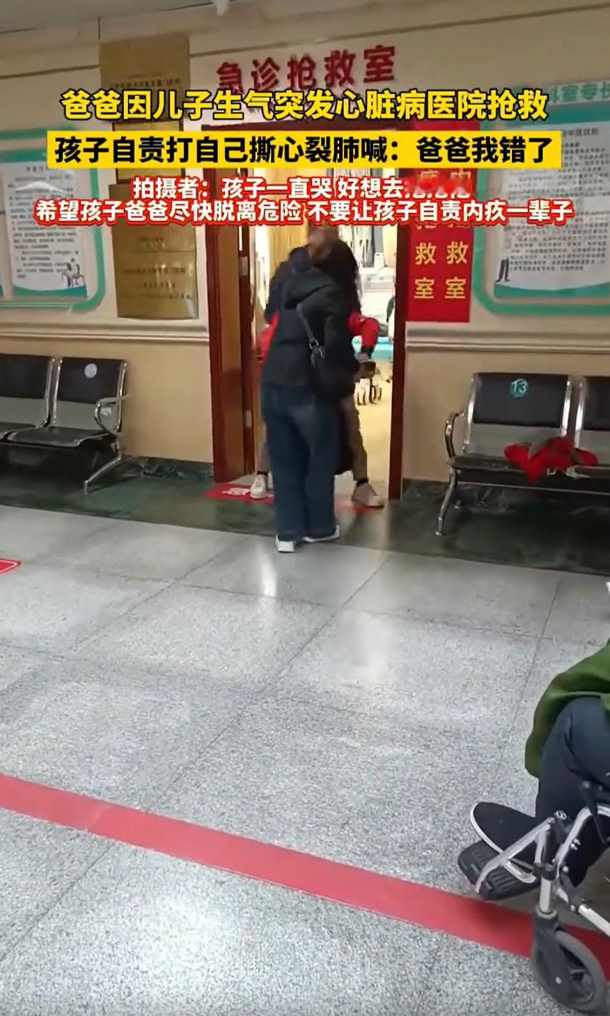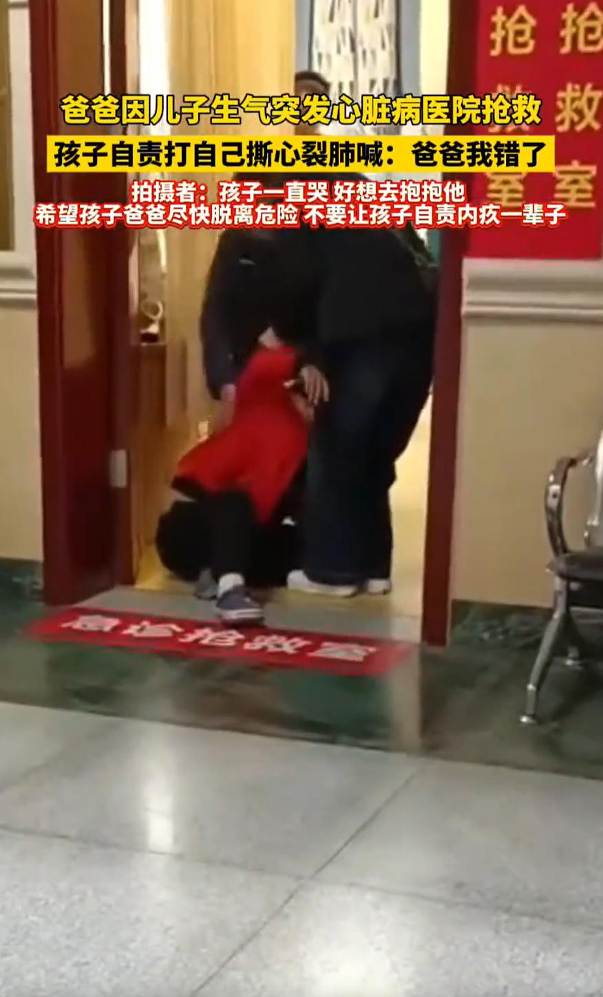 看的心疼!北京,一位爸爸因为孩子的问题生气,突发心脏病被送到医院抢救,而在抢救室的门口,孩子哭的撕心裂肺,一直喊着:爸爸我错了! 视频中,孩子和妈妈一起等在急诊抢救室门口,看到爸爸被推进去后,孩子当场自责,又是打自己,又是撞墙,孩子的妈妈只能抱住他安慰,可即便如此,孩子情绪还是相当激动,不停说着:爸爸怪我,爸爸我错了 视频拍摄者表示,看到这一幕心里很难受,也想上去抱抱这个陌生的孩子,希望孩子爸爸能够脱离危险,不然孩子可能会内疚一辈子 说句实话,这种事看着揪心,本质却很普通,普通到很多家庭都可能发生。大人累了一天,本就心力交瘁,孩子一闹情绪就上来;孩子看到大人生气,慌乱之中又不懂控制分寸,矛盾就一点点积累。平常吵吵闹闹可以过去,可一旦遇到健康问题,后果往往就不是一句对不起能抵消的 孩子不是坏,只是不懂事;父母不是凶,只是压力大。在家里,谁也不是真的想伤害谁,只是大家都累了,都没把自己的情绪安顿好。等到事情真的发生,才意识到原来一句气话、一时冲动,都可能变成压垮局面的那根稻草 我觉得,孩子的自责说明他心里有爱,只是表达方式不对。这个阶段,比指责更重要的是让他知道一件事:大人的身体不是他的责任,他不需要背所有的错。孩子需要被安抚,母亲也需要有人扶一把,父亲更需要及时治疗和休息。每个人都得从这一刻往后看,而不是一起沉进自责里 爸爸被气到心脏病发 孩子自责打自己