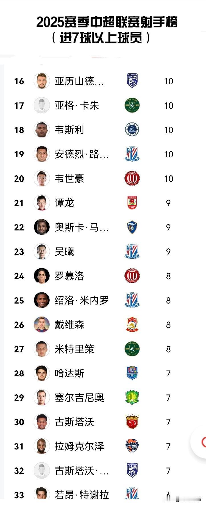 2025赛季中超联赛射手榜(进7球以上球员) 共有32名球员取得了7球以上的进球。其中,外援28人,国内球员4人(王钰栋、韦世豪、吴曦、谭龙),仅占14.3%。