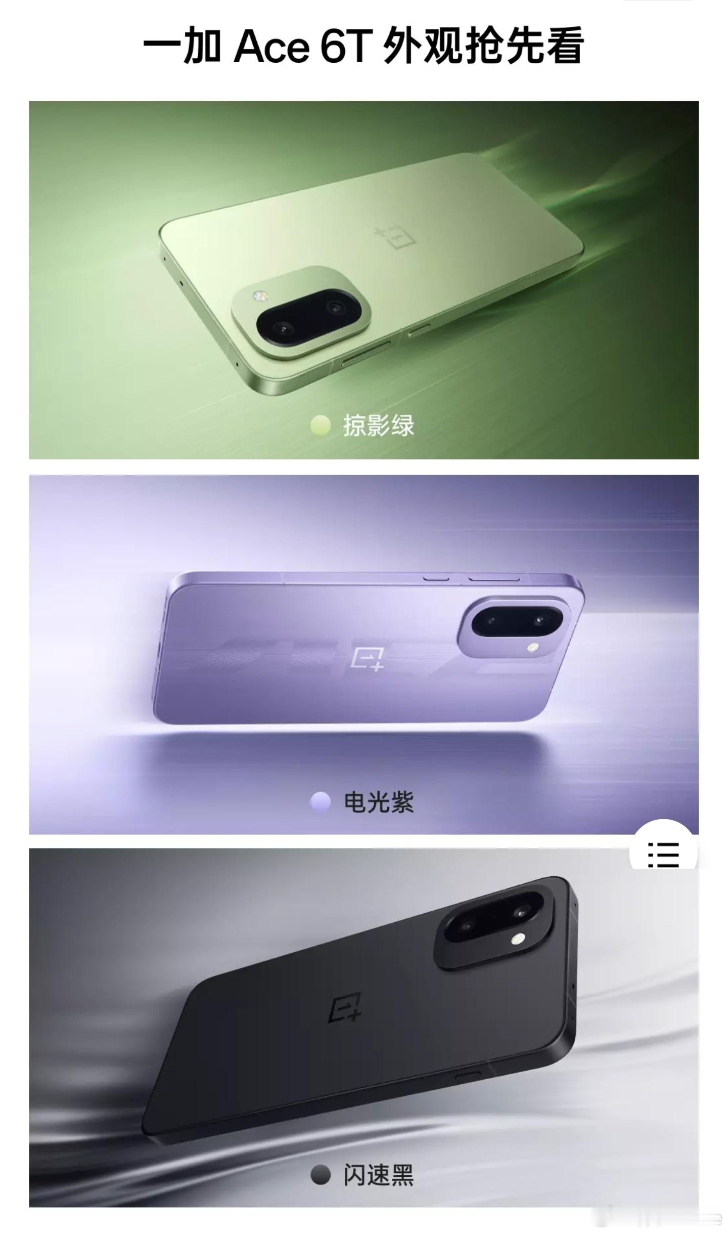 一加 Ace 6T,Ace 6相同设计语言,这外观咋样?配色:闪速黑,电光紫,掠影绿,多功能快捷键,金属中框+玻璃/玻纤后盖。