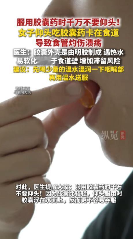 悲剧还是发生了!云南,一女子生病吃胶囊,仰头吞咽时,胶囊却卡在了食道内,本应在胃里面释放的药物提前释放,导致女子食管被烫伤,造成严重的溃疡!家人急忙将她送去医院治疗。医生:吃胶囊应保持平头或略微低头。 据纵览新闻11月20日报道,女子因为身体不舒服,需要吃一种胶囊药,跟我们大多数人的习惯一样,她倒了杯水,把胶囊放进嘴里,然后头一仰,咕咚一下就想把药吞下去。 可这一次,意外发生了,她感觉那个小小的胶囊并没有顺利地滑进胃里,而是像被什么东西黏住了一样,不上不下地卡在了喉咙和胸口之间,也就是食道的位置。 起初,她可能觉得没什么大事,就是有点异物感,于是,她又赶紧喝了好几大口水,想把那个“不听话”的胶囊给冲下去。 但结果让她越来越慌,不管她怎么喝水,那个胶囊就像在她食道壁上扎了根一样,纹丝不动,那种感觉,想必是非常难受和焦急的。 就在她手足无措的时候,更糟糕的事情来了,她突然感到喉咙里传来一阵灼烧般的剧痛,疼得她几乎说不出话来。 她这才意识到问题严重了,原来,胶囊的外壳设计是在胃里,遇到胃酸后才慢慢溶解,释放药物。 但现在,它卡在食道里,被口水和喝下去的水提前泡化了,胶囊里的药粉直接洒在了娇嫩的食道黏膜上。 很多药物,尤其是针对特定病症的,本身就带有一定的刺激性或腐蚀性,直接接触食道黏膜,后果可想而知。 那感觉,不亚于直接往喉咙里撒了一把“化学粉末”,剧烈的疼痛让她立刻赶往医院,医生检查后,结果证实了她的猜测。 她的食道已经被药物严重灼伤,形成了溃疡,原本是治病的药,却因为一个错误的吞咽动作,变成了伤人的“毒药”。 医生告诉她,食道黏膜非常脆弱,不像胃有强大的胃黏膜和胃酸环境,这种化学性烧伤需要很长一段时间才能慢慢愈合,而且愈合期间,吃饭喝水都会是一种折磨。 这件事情在网上传开后,简直是一石激起千层浪,无数网友都惊呼:“天啊,我这么多年吃药的方式竟然全是错的!” “我也是仰头吞药,感觉这样滑得快,没想到是危险动作。” “想想都后怕,能平平安安活到现在真是命大。” 这些评论铺天盖地而来,大家这才发现,一个我们从小到大、习以为常的动作,竟然埋着这么大的安全隐患。 为什么仰头吞胶囊是错的?其实道理很简单,当我们仰头时,气管会打开,食道反而会受到一定的挤压,变得更窄。 胶囊因为重量轻,又容易漂浮在水上,仰头时,水先进去了,胶囊反而可能被顶在后面,更容易贴在食道壁上。 一旦黏住,就很难再下去了,正确的做法应该是,把胶囊放进嘴里,喝一口水,然后身体坐直,头稍微向前低下,再完成吞咽动作。 这样一来,食道会变得更顺直,水流会带着胶囊顺利地进入胃里,这一个小小的改变,就能避免巨大的风险。 其实,生活中的许多“常识”和“习惯”,未必都是正确的,我们总以为吃药是件简单事,却忽略了其中科学的细节。 一个小小的胶囊,用对了是良药,用错了就可能变成伤害我们身体的利器。 这件事也让我们反思,对于健康知识的普及,我们做得还远远不够,很多看似微不足道的生活细节,背后却关联着我们的身体健康。 希望通过这位女士的亲身经历,能让更多人意识到正确服药的重要性,别再仰头吞药了,一个小小的低头动作,保护的是我们自己。 以后再吃药时,不妨多想一秒,用正确的方法,让药真正地治病,而不是致病。 信源:纵览新闻2025-11-20——云南一女子服用胶囊药仰头吞咽时发生意外,胶囊卡在食道上,药物提前释放导致食管灼伤溃疡。