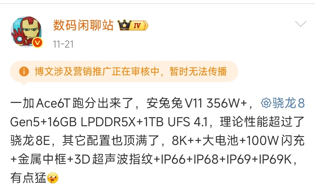 一加Ace 6T外观来了! 闪速黑、掠影绿、电光紫三色,撞色果子17标准版颜色,安兔兔跑分356w±分,有点猛,高通骁龙8Gen5,金属中框+3D超声波指纹+满级防尘防水,8K+大电池加百瓦快充!