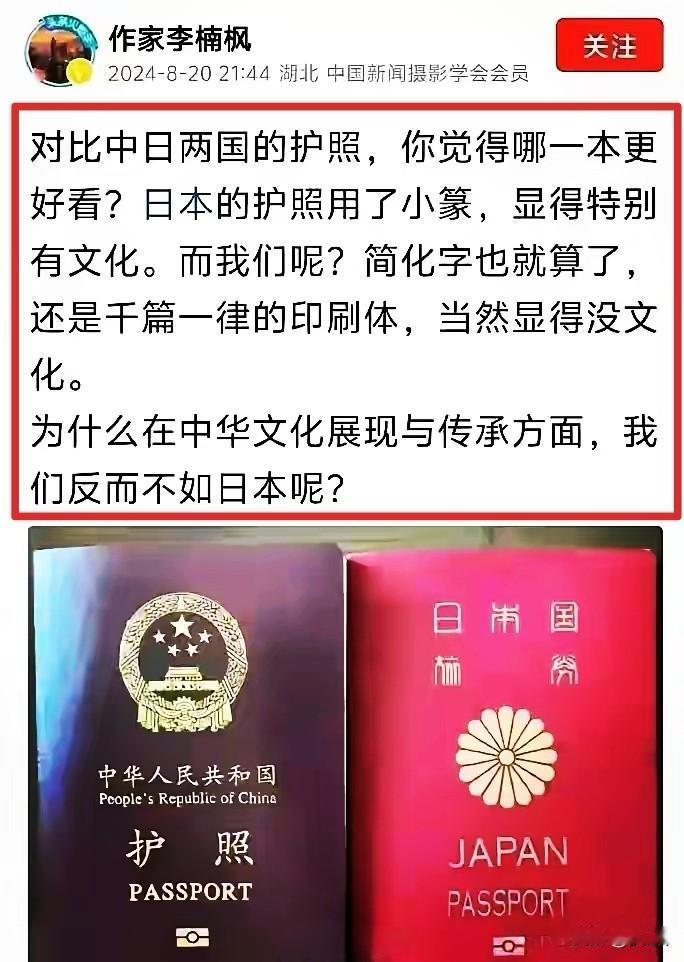 这是一位被全网清算的精日帖子, 就在去年,他竟把中国护照和日本护照摆一块儿,大放厥词称 日本有文化而中国没有,还妄言中华文化传承不如日本。 当时我就对这种舔日言论恶心到不行,这不就是妥妥的“精神剑客”嘛! 如今再回头看,这人的谬论简直和高市早苗之流如出一辙,纯属没事找抽型。咱中国的山水养育了无数优秀儿女,咋就出了这么个扭曲的玩意儿?连日本都舔的人,内心得多阴暗啊!这种人不仅瞧不起中国人,还跟日本右翼一样,自讨没趣。 文化传承靠的是一代又一代人的努力,中华文化博大精深,岂是这种跳梁小丑能随意诋毁的?