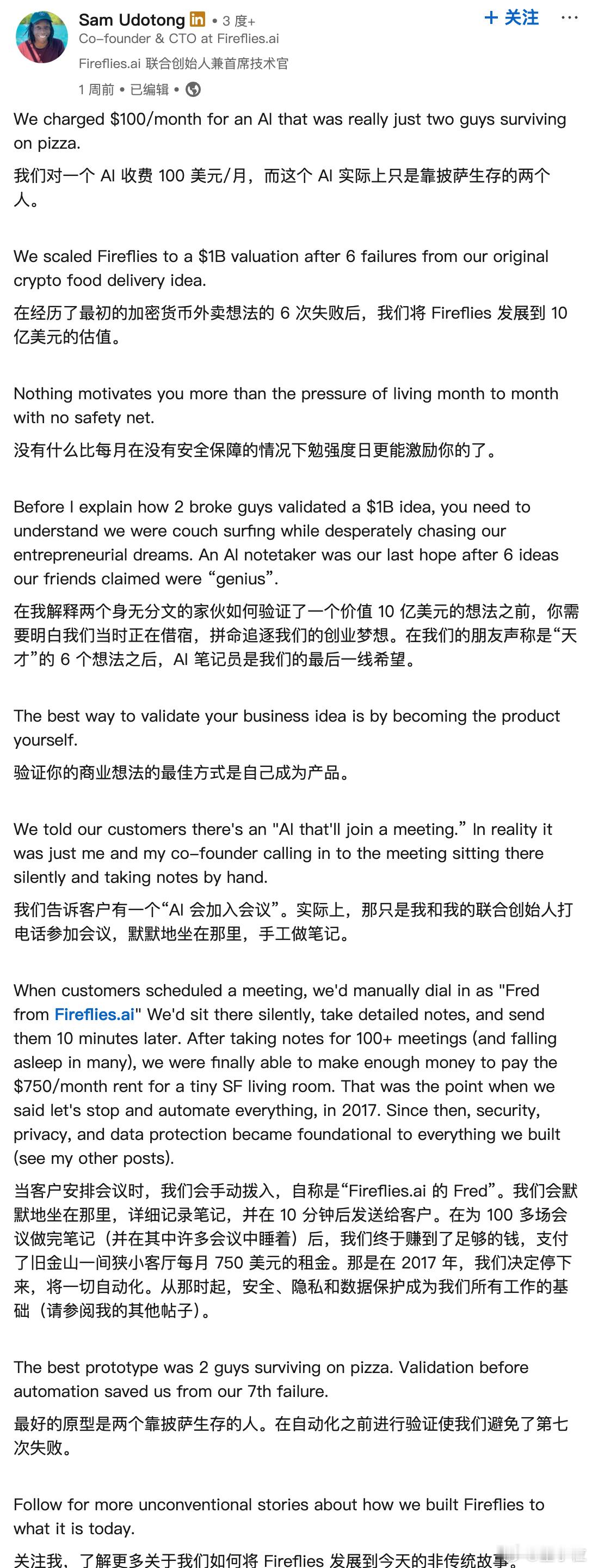 估值10亿美元的AI笔记公司Fireflies最近自曝了一段黑历史:2017年以前,他们根本没有AI,所有会议纪要都是两位创始人手敲出来的。Fireflies联合创始人兼CTO在领英上承认,公司早期推出所谓的"AI笔记员Fred",实际上就是他和搭档本人。客户以为是AI在记录会议,实际上是两个大汉躲在屏幕后面疯狂敲键盘。事情得从2016年说起。当时两位创始人刚经历第六次创业失败,身上分文不剩,每天靠披萨充饥。AI笔记是他们最后的救命稻草,但没钱开发产品。于是他们想出一个"天才主意":既然AI笔记只需要会后交付结果,为什么不直接假装成AI?反正客户也看不出来。就这样,他们开始向客户兜售每月100美元的"AI助手"服务。每次有会议时,他们就以Fred的身份手动拨入,全程旁听并做笔记,会后10分钟发送纪要。就这么干了100多场会议,终于攒够钱从披萨盒堆满的小房间搬了出去。CTO本想分享这段励志创业故事,没想到全网炸了锅。网友最在意的是隐私问题:那么多机密会议内容,居然被陌生人全程旁听?这哪是笔记软件,这是间谍软件。有人直接开骂:"我不懂撒谎有什么激励人心的。"还有自动化工程师指出,这种行为足以重创Fireflies的品牌形象,人们以后都会怀疑他们的会议是否安全。对此,CTO回应称公司从2017年起就不再这么干了,现在所有笔记都已完全自动化。而且早期企业客户其实知道"流程中有人为参与"。不过也有人为他辩护,认为"先人工、后智能"是初创公司验证需求的聪明做法。毕竟重点是证明产品价值,而不是一上来就把技术全做出来。讽刺的是,Fireflies如今确实成了AI笔记领域的真正巨头。他们服务全球50万家机构、2000万用户,75%的财富500强企业都在用,2023年就已实现盈利,而且自2021年后再没融过资。难道说,在「人工智能」的早期摘掉「智能」……反而更容易赚钱?