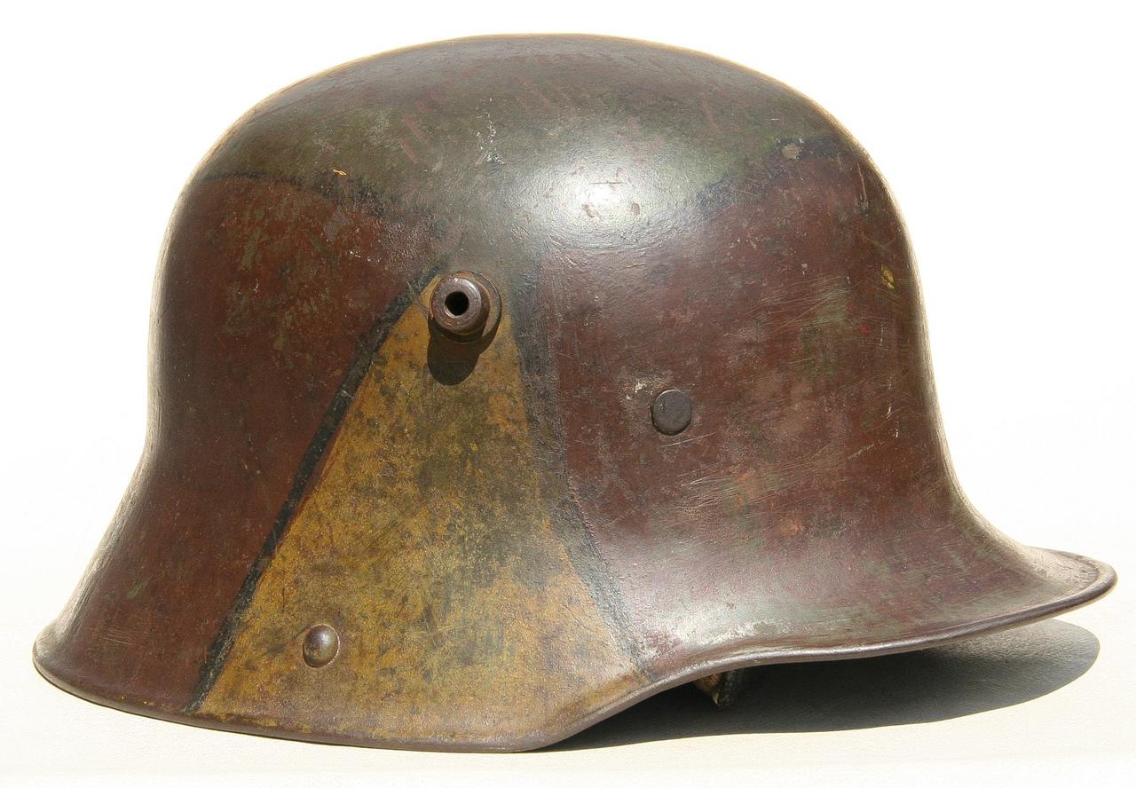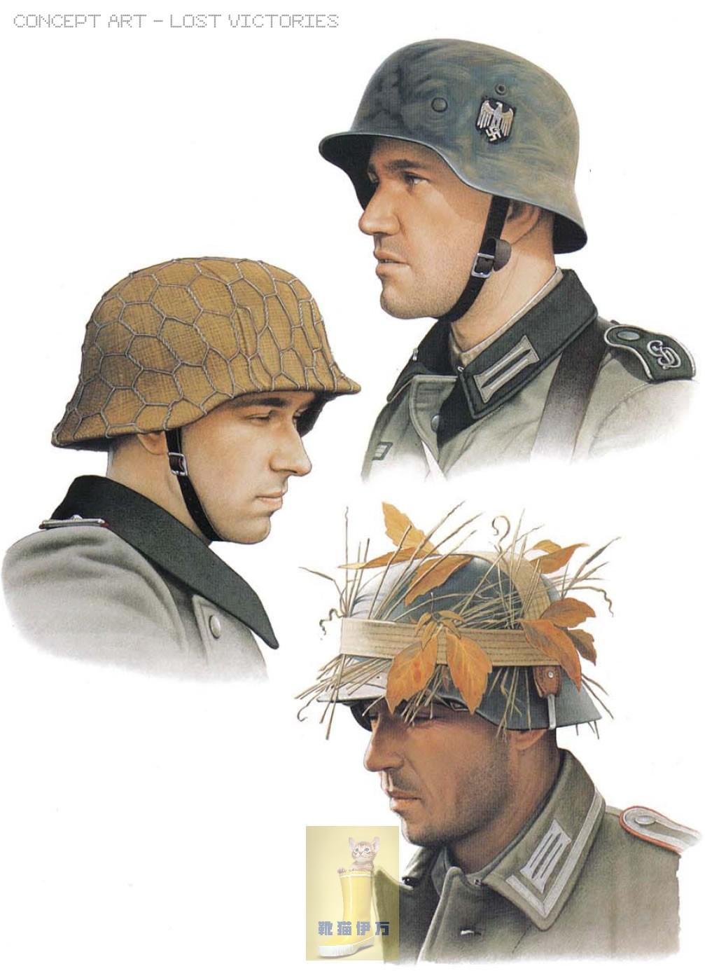 1941年7月14日,东线战场。一名国防军士官留影。大家注意:该士兵头盔包裹着盔罩,不过不是标准伪装布料,应该是在战场上赶工的。 二战初期,德军头盔喷漆之后,在阳光下会亮闪闪的,比较容易暴露目标(狙击手最喜欢这样的目标)。后来,有经验的老兵就会在头盔上涂抹泥浆,或者插入草木进行伪装。不过,这样搞虽然方便就地取材,但是容易锈蚀钢盔,而且很容易就会脱落。所以到后来就改为了制式的盔罩(参见图2)。 不得不说,实践是检验真理的唯一标准。战场上尤其是这样。亮晶晶的钢盔看上去非常漂亮,不过可是要命的啊~ 题外话:一战时期德军也会在钢盔上进行伪装,不过是简单的手工涂抹油漆,伪装效果有限(参见图3).