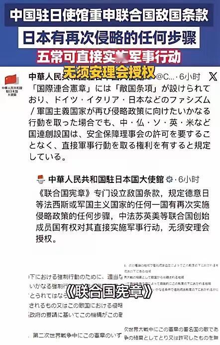 日本悬着的心,可以彻底死了。 东大这次明明白白的昭告天下,东大不需要联合国的授权,就可以合理合法的出手教训日本。这是因为敌对国条款,已经明确赋予了,中美苏等二战战胜国——当发现德、意、日这些二战战败国,在战后若有再次发动侵略的意图和行径,就可以在没有联合国以及安理会的授权下,直接出手教训他们的权力。 而日本现在的所作所为,无一例外都是严重践踏了《和平宪法》,无一例外都是背离了日本专守防卫的发展战略,甚至还妄想彻底颠覆二战战后形成的国际秩序。既然如此,东大自然就可以名正言顺的惩戒他们!