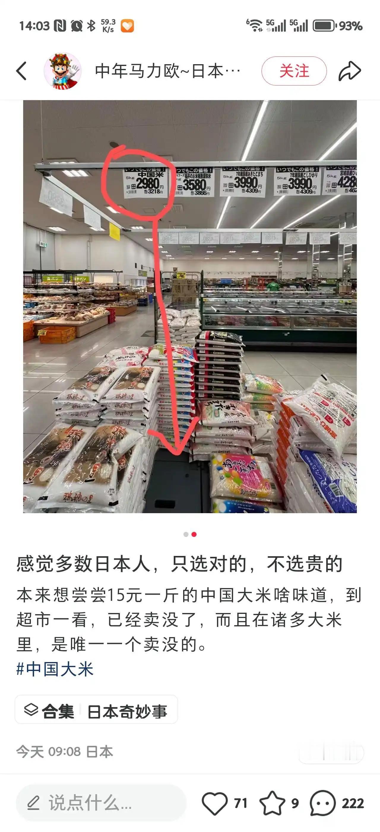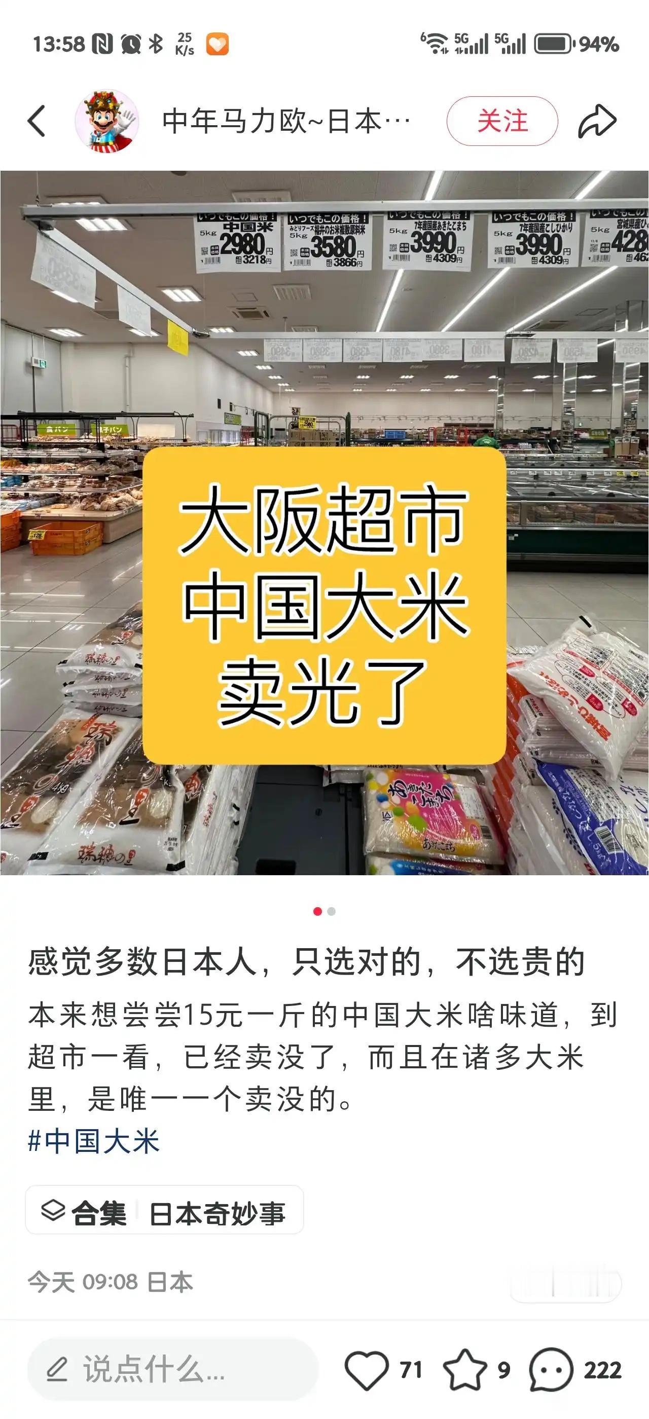 日本人还是诚实,嘴里抵制中国米,实际购买还是看价钱。特别是大米口感几乎吃不出来差别,用在餐饮里根本没人看得出来。难免商家更愿意买中国大米。 大米价格只是其一,等日元继续贬值,日本人怕不是所有东西都要从中国网购来压低生活成本。现在高士已经打响了日本经济崩盘第一枪,后续美国再抽血一次,日本大概率就完了。