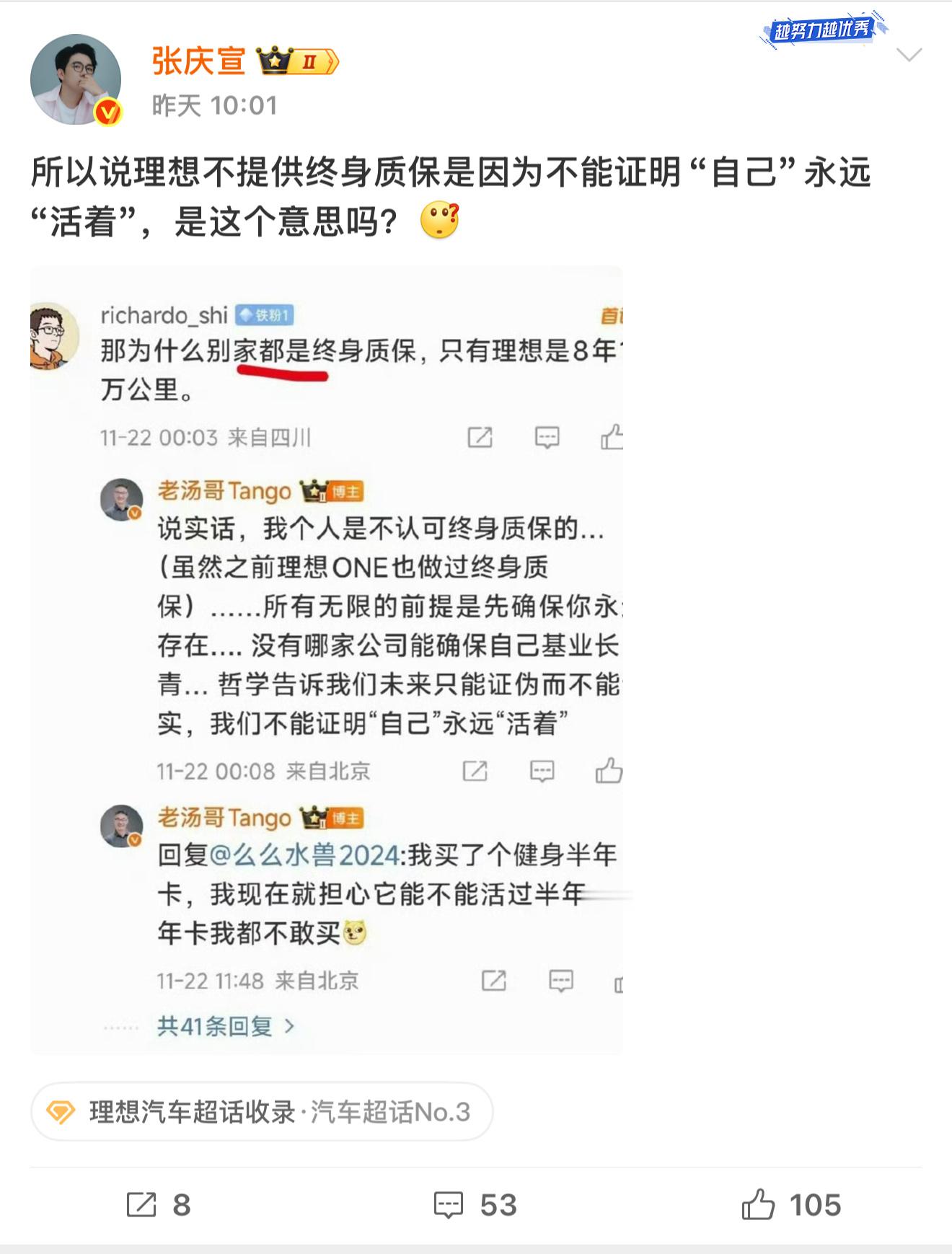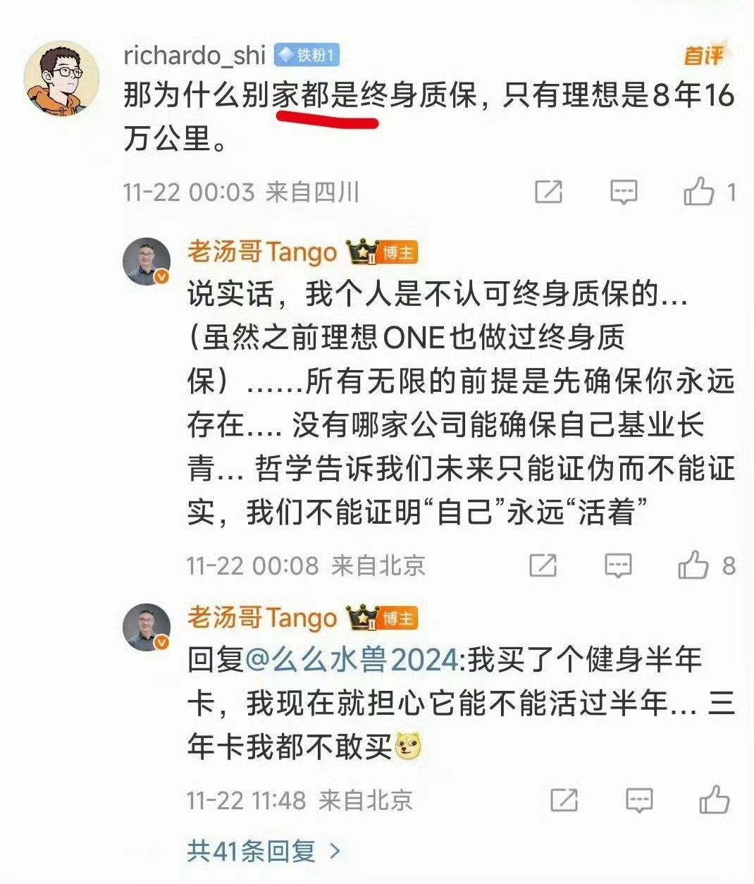终身质保说白了还是看自己本身底气,但我还是喜欢政策跟车不跟人的政策,因为这种权益在二手市场流通性很强。二任车主跟首任车主享受到的政策完全一样才是底气对待“活着”这个问题不好讨论,极越这种没有征兆的塌房后,我看高管团队还是别拿这俩词开玩笑了