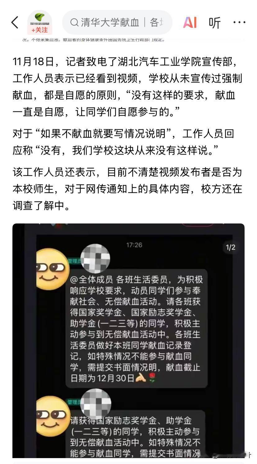 11月17日,有湖北网友在社交平台发帖称,湖北汽车工业学院要求获得奖学金的学生献血,不能献血要写书面说明,引发热议。 真是道德绑架的恶例,将奖学金与献血挂钩,是典型的行政权力对学生进行的道德绑架和隐形强制!这严重违背了无偿献血法中“自愿”的基本原则!以往大学里献血有的和学分挂钩,不过那是自愿的!献血乱象