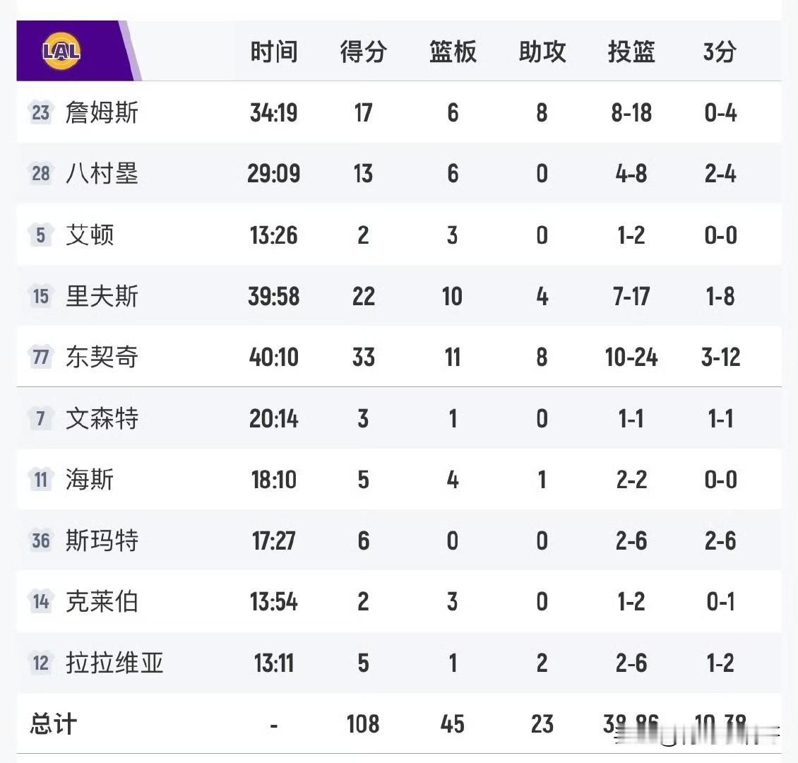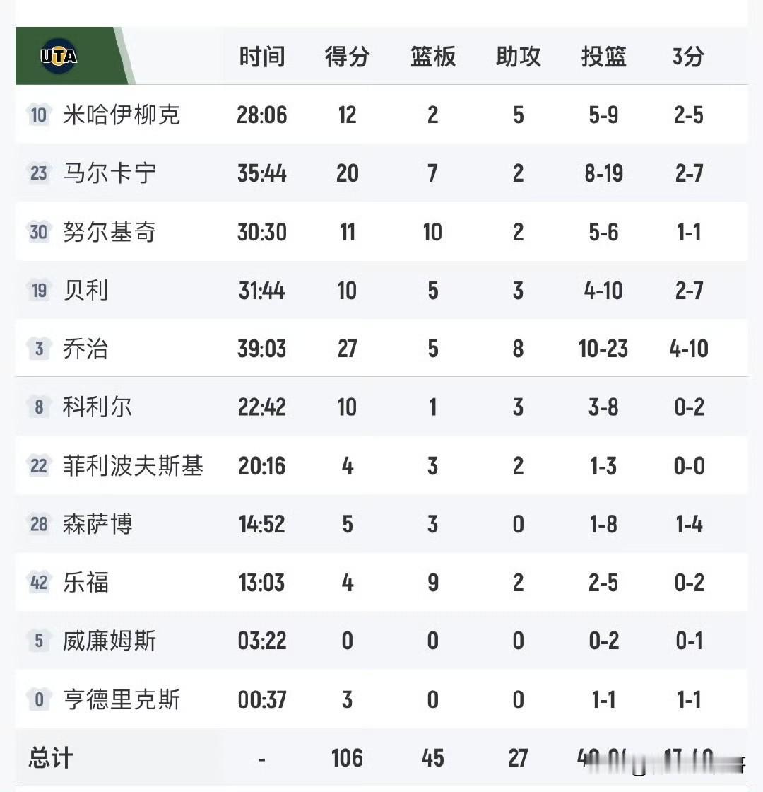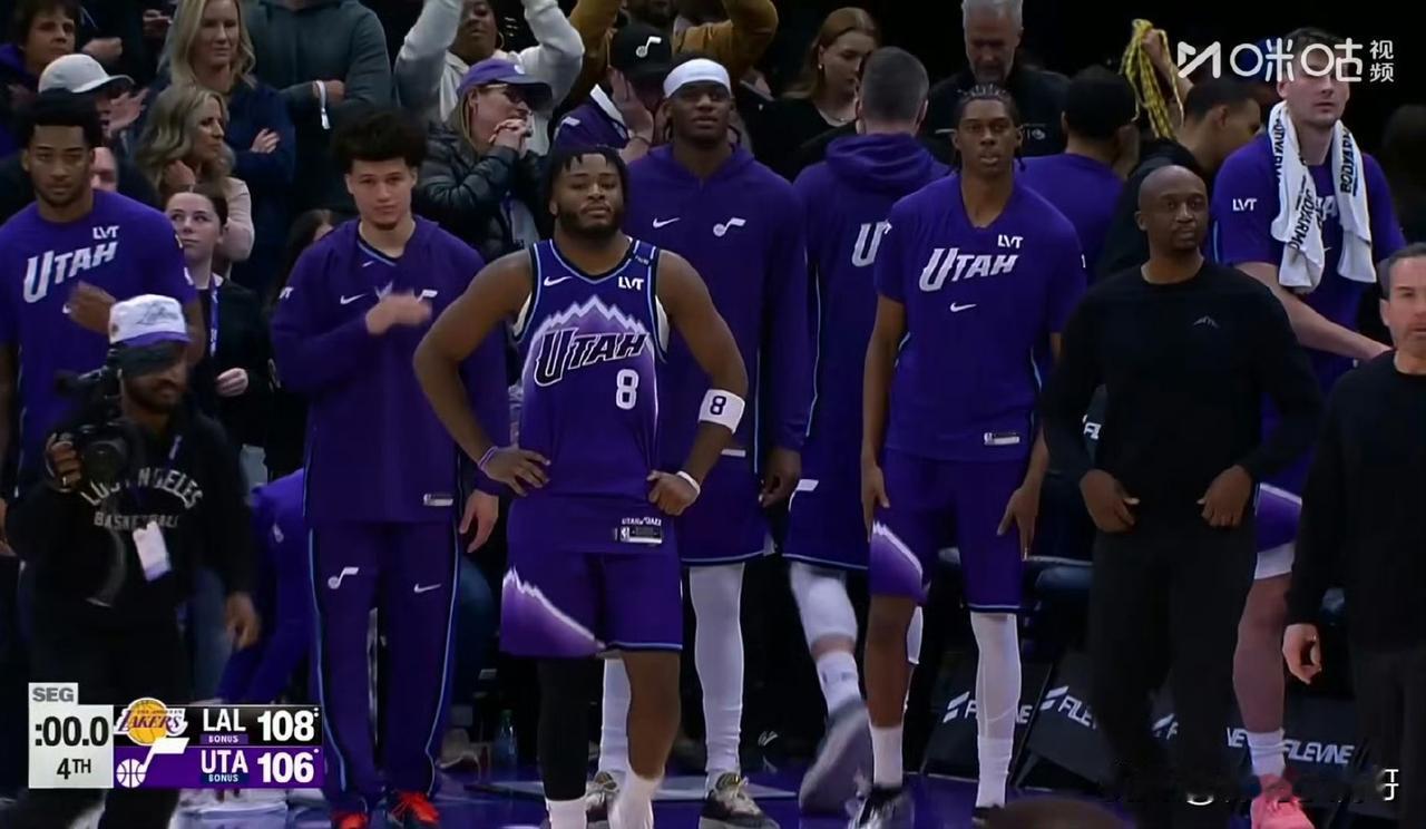 湖人升至西部第二!!!东契奇33+11+8,湖人客场险胜爵士迎4连胜! 在刚刚结束的一场比赛,湖人客场108-106险胜爵士,他们险些被爵士逆转,但是他们坚持了下来,球队迎来了四连胜! 湖人方面,东契奇33+11+8,里夫斯22+10,三分球8中1,詹姆斯17+6+8,三分4中0,今天首发三分除了八村还可以其他人表现都不行。 爵士方面,乔治27+5+8,努尔基奇11+10,马尔卡宁20+7,乐福得到4分9篮板。 本场比赛结束后湖人排名升至西部第二,歇了几天突然比赛可能不太习惯,湖人今天可乐杯表现出色,全队都为他喝彩,虽然只有2分入账,但是他是赢球的最大功臣。 湖人 东契奇 詹姆斯 爵士