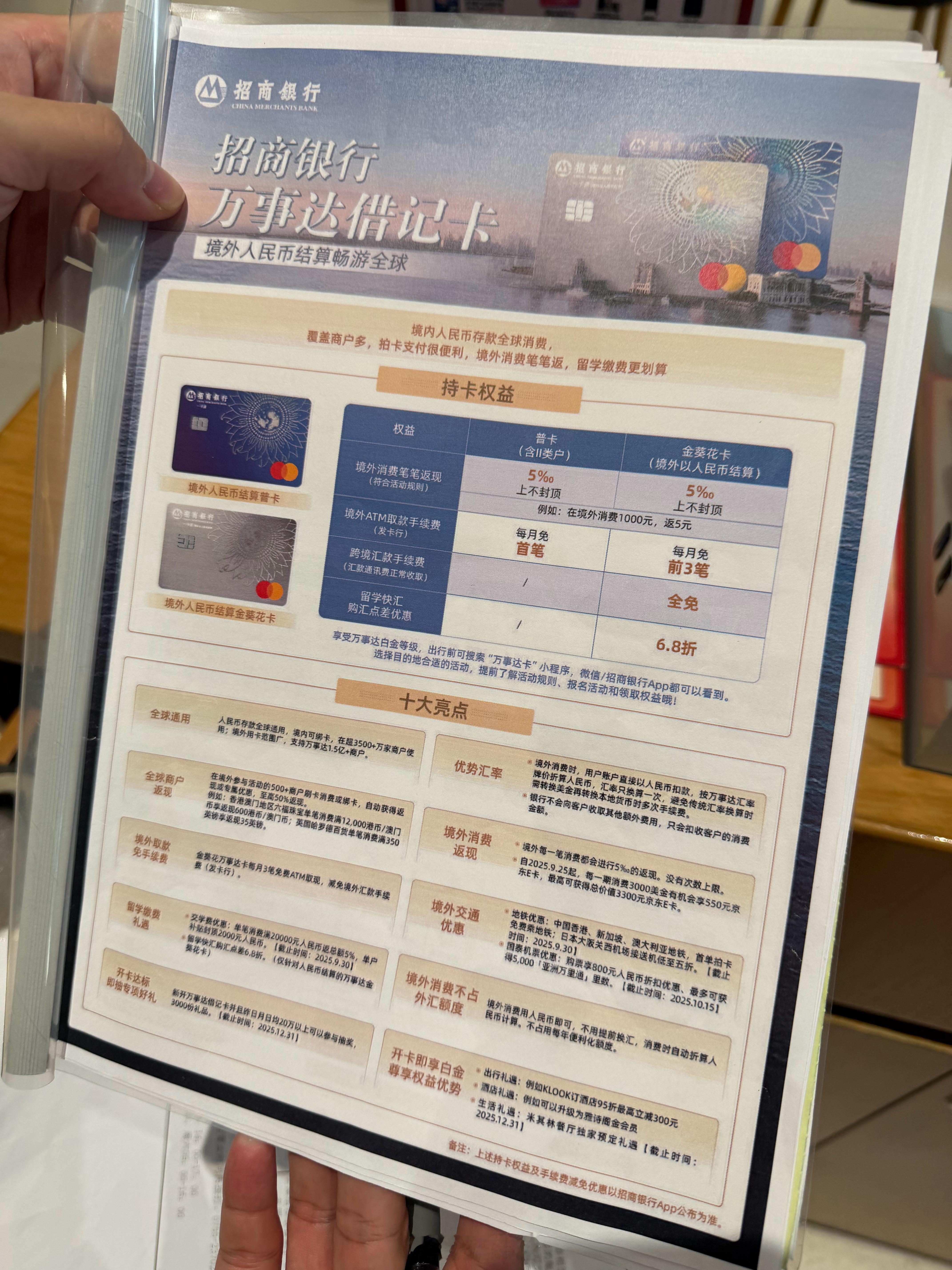 刚刚午餐完,去招行办了张万事达借记卡,境外取现免费,今年万事达也发力了,和AE一样用人民币结算,就是不知道什么时候能到绑个Applepay
