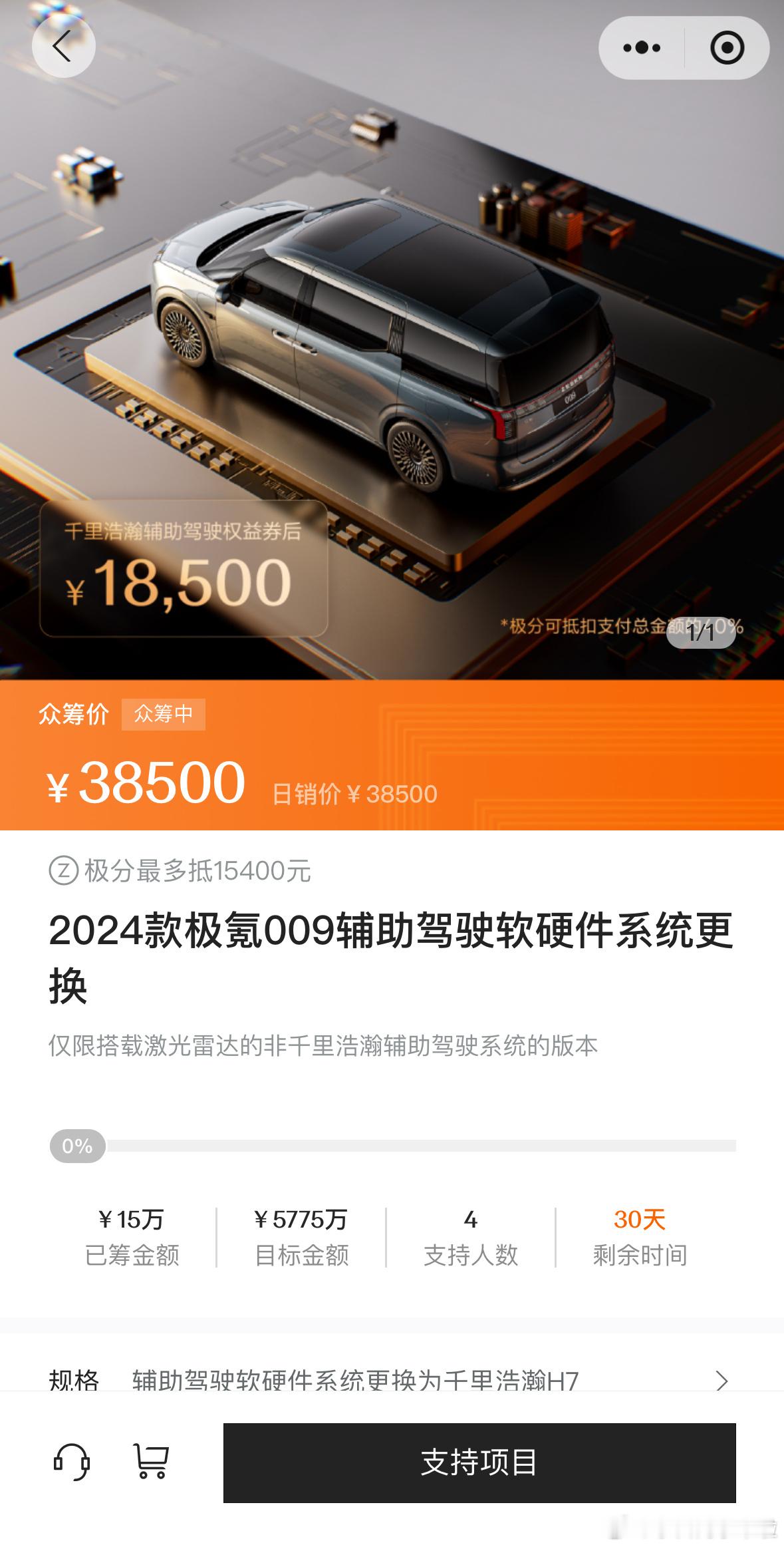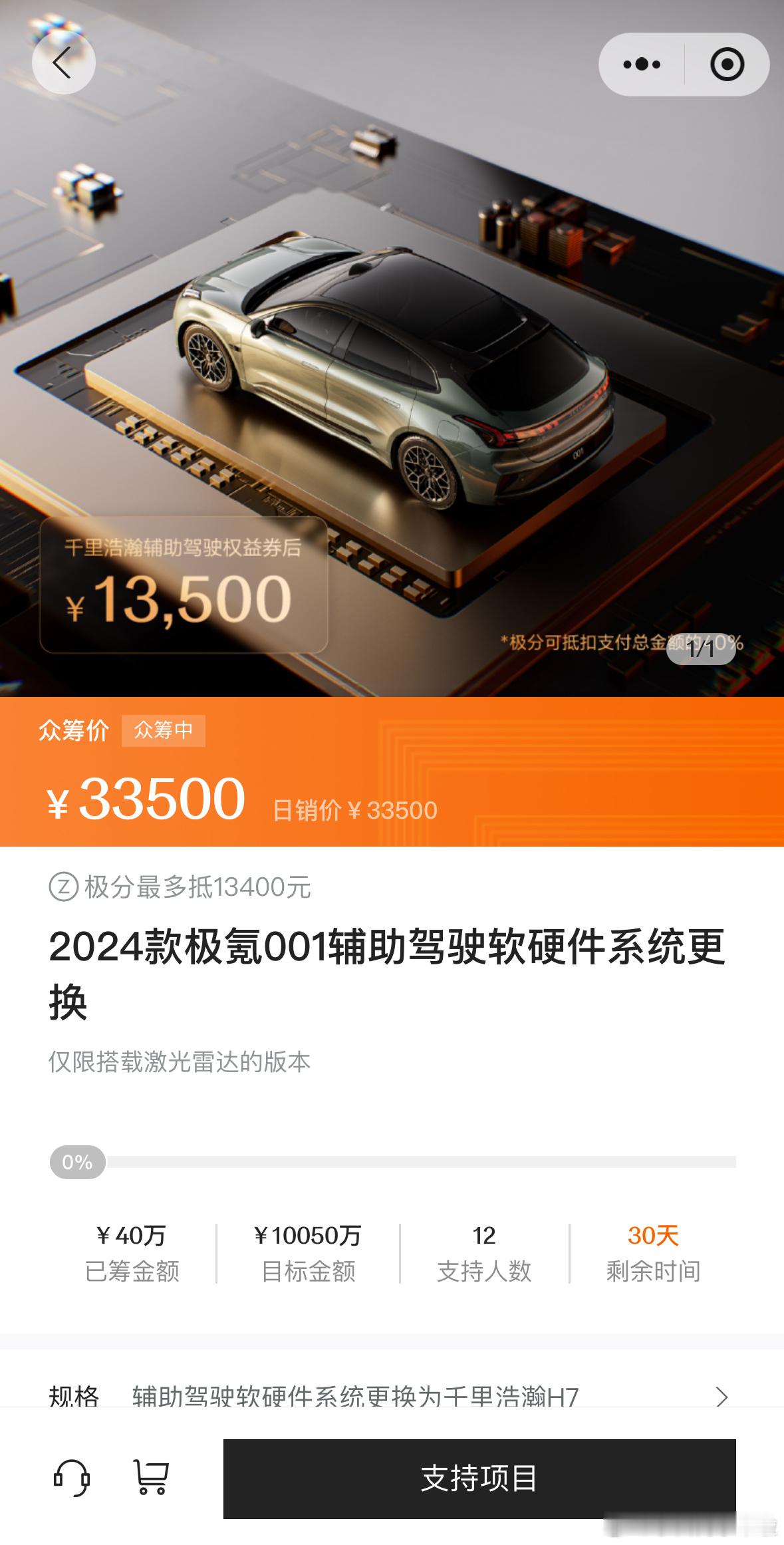 搭载激光雷达的2024款极氪001和极氪009辅助驾驶软硬件系统更换用户众筹项目来了。极氪 001 千里浩瀚辅助驾驶权益后价格 13500 元,目标金额 10050 万。极氪 009极 千里浩瀚辅助驾驶权益后价格 18500 元,目标金额 5776 万。