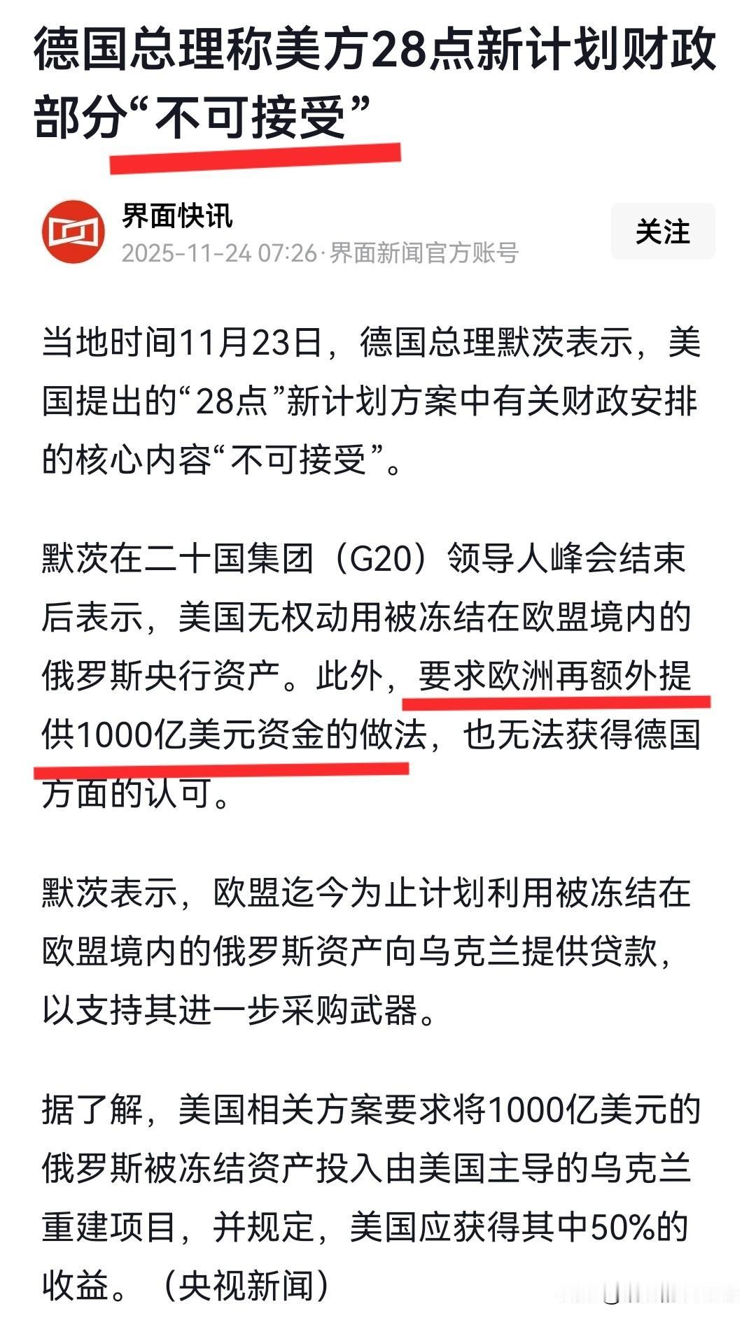 美国提出28项俄乌和平条款,让欧洲再额外拿出1000亿美元…[捂脸] 乌克兰至今也不承认自己被骗了,当初美西方都告诉乌克兰放心,即便乌克兰加入北约,俄罗斯也不会动手。 俄乌打起来后,美西方又告诉乌克兰可以放心,他们会不惜一切代价帮助乌克兰取得胜利。 乌克兰领土丢了;工业垮了;乌克兰人家园毁了;人跑没了; 然后美国语重心长地对乌克兰说,同意20点就可以和平了。 合着里外里乌克兰被坑了还得满面笑容的说谢谢… 朋友们,你们对此事怎么看? 欢迎大家在评论区探讨,留言…[送心]