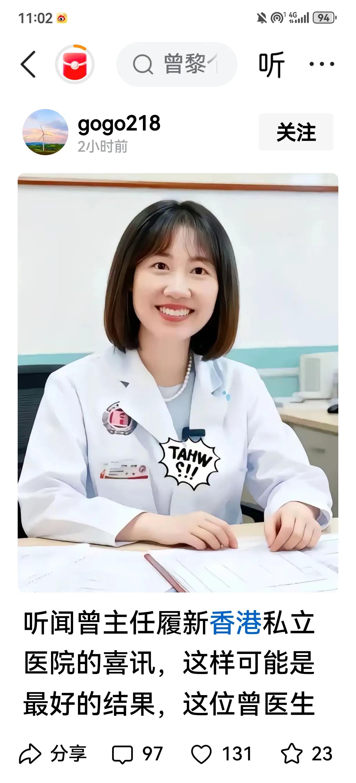 祝福曾医生履新! 为她的敢作敢为和真性情点赞。