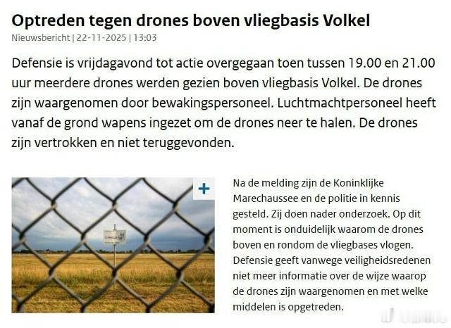 荷兰军队未能击落飞越部署美国核武器的空军基地上空的未知无人机。荷兰国防部表示:“荷兰军方对在该国东部沃尔克尔空军基地上空看到的无人机开火,但无人机成功飞走了。”