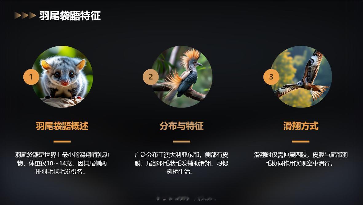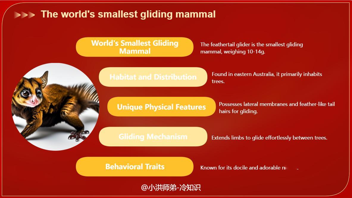 世界上最小的滑翔哺乳动物世界上最小的滑翔哺乳动物是羽尾袋鼯。羽尾袋鼯广泛地分布在澳大利亚东部,因为在它的尾侧有两排毛发,看起来很像羽毛,所以我们叫它羽尾袋鼯。它是一种会滑翔的袋鼯,十分乖巧、可爱,体重一般在10~14克。羽尾袋鼯一般都习惯生活在树上,并且大多数羽尾袋鼯的侧部都长有皮膜,其尾部的羽毛状的毛发也可以帮助其飞行。它滑翔的时候,只需要把四肢伸展开来就可以了。||