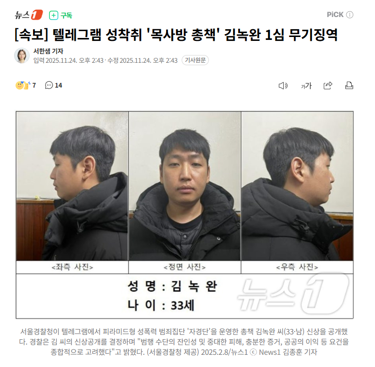 【韩国telegram性剥削“牧师房头目”金禄完一审被判处无期徒刑】 Telegram性犯罪组织“自卫队”的头目金禄完在一审中被判处无期徒刑。首尔中央地方法院刑事合议26部(审判长李贤景部长法官)于24日对因涉嫌组织犯罪团伙及活动、制作及散布性剥削物及非法拍摄物、强迫使用非法拍摄物、准强奸等罪名被起诉的金某判处无期徒刑。金某涉嫌运营基于Telegram的性犯罪组织“自卫队”,并犯下各种性剥削罪行。调查确认,从2020年5月到今年1月,他不分男女地制作性剥削材料,受害者人数高达261人。这一数字超过了此前赵主彬运营的“博士房”事件受害者(73名)的三倍,是韩国网络性剥削案件中规模最大的。据调查,金某自称“牧师”,并授予组织成员“传道士”等职位,有组织地进行犯罪。据称,他是在看完Netflix电视剧《苏里南》后迷上了这类称呼。此前,检方曾向法院请求判处金某无期徒刑、并命令其佩戴电子定位装置30年等。