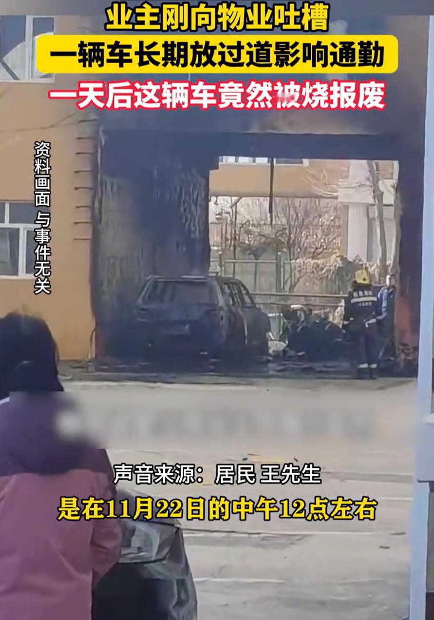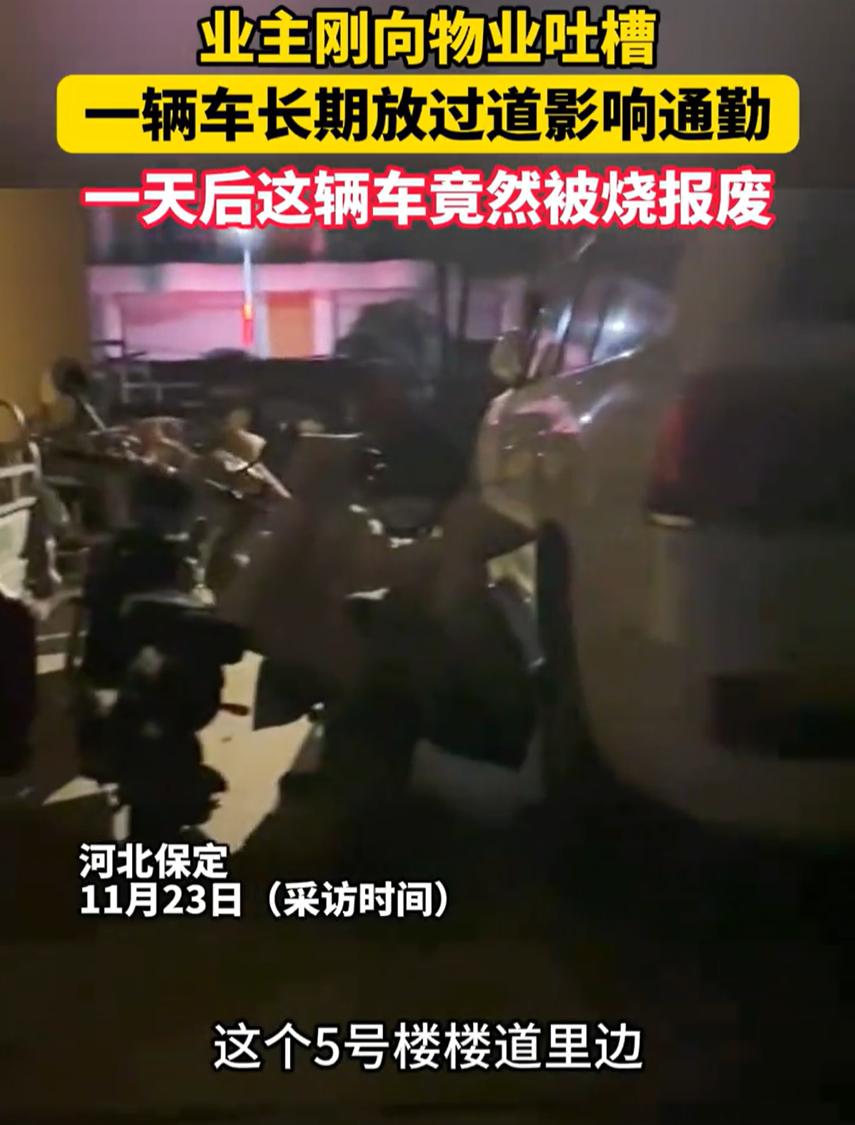 “这下解释不清楚了!”河北保定,女子晚上回家时,向物业吐槽,一辆私家车长期停放在楼道过道里,能不能找车主去沟通一下,可让她没想到的是,仅仅过去一天,这辆车竟然被燃着报废了。网友调侃:物业真办事啊! 据悉,这辆车在楼道停放已经有一个多月的时间,本来车子本身就占地方,再加上旁边有电动车,很多住在这号楼的业主回家都要绕道,这天女子晚上回家,终于忍不了了,就把视频发到了业主群,向物业反映 本来也就是发发牢骚,没指望能立刻解决。可谁都没想到,第二天中午十二点左右,那辆车所在的地方竟然起火了,火势还不小,最后直接烧成了空壳。 对此,不少网友纷纷调侃:物业有事真上啊,业主有需要立马解决,这物业费我交定了,谁来说都不行! 当然,大家都明白,火灾不可能是人为的,更不可能是物业“动手”。但这事巧合得就像段子,让人忍不住联想 其实类似的情况在很多老小区都不少见。楼道、过道、消防通道,常被一些车辆或杂物占用。平时大家忍一忍也就过了,可一旦出事,就成了安全隐患 这次车辆起火原因目前还不清楚,有可能是车辆线路老化,也可能是别人丢的烟头没熄灭,甚至可能是电动车充电引发的。但无论如何,乱停乱放的车辆不仅影响通行,更在无形中埋下了风险 这次的火,某种程度上算给其他住户提了个醒。物业也需要从这件事上看到压力点,不是等群里有人喊才去巡查,而是把楼道安全当成日常工作。车主也得明白,占用公共空间不是聪明事,方便了自己难为了别人