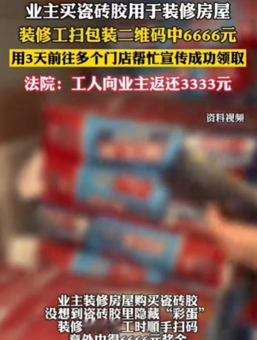湖北咸宁,男子李某装修房子雇了贴砖师傅王某,施工时王某意外发现瓷砖包装二维码,扫码中了2万红包还抽到6666元奖金,李某得知后觉得奖金该归自己,要求王某返还遭拒,便将对方告上法庭,这奖金到底该归谁呢? 装修是个磨人的活儿,业主为了气派效果一掷千金,工人为了碎银几两挥洒汗水,但这原本泾渭分明的雇佣关系,在湖北咸宁的一场“意外之财”面前乱了套。 故事的主角是业主李某和贴砖师傅王某,两人原本相安无事,甚至因为王某干活实诚、从不偷懒,这工期推进得颇为愉快。可谁能想到,一块瓷砖包装箱上的二维码,竟成了两人对簿公堂的导火索。 这事还得从施工现场说起。王某是个老实巴交的手艺人,平日里除了埋头苦干,也就中午吃饭时能喘口气。 那天他正好累了,目光无意间扫到了堆在一旁的瓷砖包装箱,上面印着的二维码勾起了他的好奇心。这一扫,平静的日子算是打破了——手机屏幕上不仅弹出了红包,更关键的是,他还幸运地抽中了让人眼红的一等奖,现金高达6666元。 若是这钱直接进了微信零钱,可能也就没人知道了。但天下没有免费的午餐,这6666元不是点了就能领的。 根据品牌方的要求,这笔奖金的发放有着严格的门槛:中奖者必须配合线下门店进行宣传推广。这时候,王某并没有觉得自己是“偷”了业主的运气,他甚至为此专门向李某的项目请了三天假,跑前跑后配合品牌方做广告、搞宣传,这才把真金白银落袋为安。 时间一晃到了2025年8月,这笔奖金在王某手里还没捂热乎太久,风声就传到了业主李某的耳朵里。 在李某看来,逻辑简直无懈可击:瓷砖是我花重金买的品牌货,所有权归我;包装箱作为附属品自然也是我的。 既然“母体”是我的,那生出来的“蛋”——这个奖金,天经地义就该进我的腰包。李某心里那个气啊,觉得这贴砖师傅不地道,拿着我的东西发了横财,居然一声不吭。 但王某那边更委屈。他承认砖是老板买的,但二维码是自己发现的,更重要的是,那6666元不是天上掉下来的,是自己搭进去三天工时、跑断腿配合宣传换来的“辛苦钱”。 要是没有自己这一扫、这一跑,这奖金哪怕有座金山也是废纸一张。双方各执一词,谁也说服不了谁,最后只能闹到了咸宁中院。 这案子到了法院,成了一个典型的法理与情理的博弈局。从法律条款上抠,那是有明确规定的。法院审理发现,品牌方搞这个抽奖活动的初衷是为了回馈消费者,规则里白纸黑字写着“参与资格须为产品购买者”。 按照《民法典》关于所有权的规定,李某作为瓷砖的买单人,确实是这笔奖金名正言顺的原始权利人。照这么看,王某似乎理亏。 可法律从来不是冷冰冰的教条。法官在审理中敏锐地捕捉到了一个关键细节——“劳动付出”。虽然抽奖资格归业主,但如果没有王某并未随意丢弃包装、敏锐发现二维码,并且付出了三天的时间成本去兑现,这笔钱根本就不存在。 换句话说,王某的行为属于一种“无因管理”或者说是对奖金落地的实质性贡献。如果让王某全额吐出来,无视他请假三天的误工损失和劳动投入,显然违背了民事活动中的“公平原则”。 最终这笔意外之财的分配既没有搞“平均主义”,也不是“独吞主义”。法院给出了一个充满智慧的判决。 既然李某是所有权人,王某是出力兑奖人,那这果实就得切分开来吃。考虑到王某为了领奖折腾了三天,结合他的日工资标准,法院判定王某需要从奖金中拿出一部分退还给李某。 那个具体的数字定格在了3333元。这个数字很有意思,大约是总奖金的一半。这既承认了李某作为购买者享有的所有权权益,也变相认可了王某作为发现者和执行者的劳动价值,宣判那一刻,王某也是爽快人,当庭就履行了义务,把钱退给了李某。 这场因装修引发的“分钱大战”算是画上了句号。它给我们提了个醒:运气的归属有时候不光看“谁买的单”,也得看“谁跑的腿”。 面对从天而降的利益,所有权固然重要,但对他人的劳动付出保持一份起码的尊重,或许才是解决纠纷的最好黏合剂。