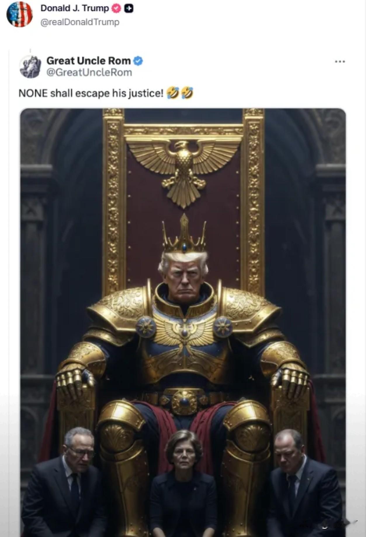 最新消息 特朗普自封“国王”! 民主党大佬跪地 放话“无人能逃审判” 11月24号,特朗普在自己的社交账号上发了张特别扎眼的图。图上明晃晃写着“特朗普国王”,民主党的查克·舒默还有其他几位民主党人,全都低着头跪在他面前,配的文字更硬气,直接喊“无人能逃脱他的审判”。查克·舒默可不是普通政客,是民主党在参议院的领袖,在美国政坛里说话分量极重,平时跟特朗普就没少掰手腕。 这俩人的矛盾早就摆到台面上了,之前为了避免政府停摆,舒默几次三番呼吁特朗普坐下来谈判,可特朗普就是硬顶着不松口,两党吵来吵去最后还是没谈拢,差点让几十万联邦工作人员无薪休假。不光是政府预算,在对乌援助、医保补贴这些民生和国际议题上,双方也一直针锋相对,舒默还曾公开指责特朗普在一些事务上“软弱无力”。而且特朗普这也不是第一次玩这种夸张操作,之前就发过自己挥棒球棍“教训”检察官的合成图,还拿假图甩锅,向来喜欢用这种博眼球的方式攻击对手。现在他刚当选下任总统,离上任没几个月就发这图,明显是想借着势头打压民主党,巩固自己的支持者。 政治争斗归争斗,但用“国王审判”的架势贬低对手,实在太出格。民主社会讲的是相互尊重、平等协商,不是把自己捧成高高在上的“君主”,把对手踩成跪地求饶的模样。这种操作看着热闹,实则是在火上浇油,让本就分裂的美国社会更难走到一起。大家真正需要的是能解决问题的政策,是让日子越过越稳的行动,而不是这种博眼球的政治闹剧。靠夸张图片和狠话撑起来的声势,根本解决不了民生难题和社会分歧,反而会让政治变得越来越浮躁,越来越没底线。 特朗普发难 特朗普乱政 特朗普状态 特朗普20条 特朗普怒斥美国