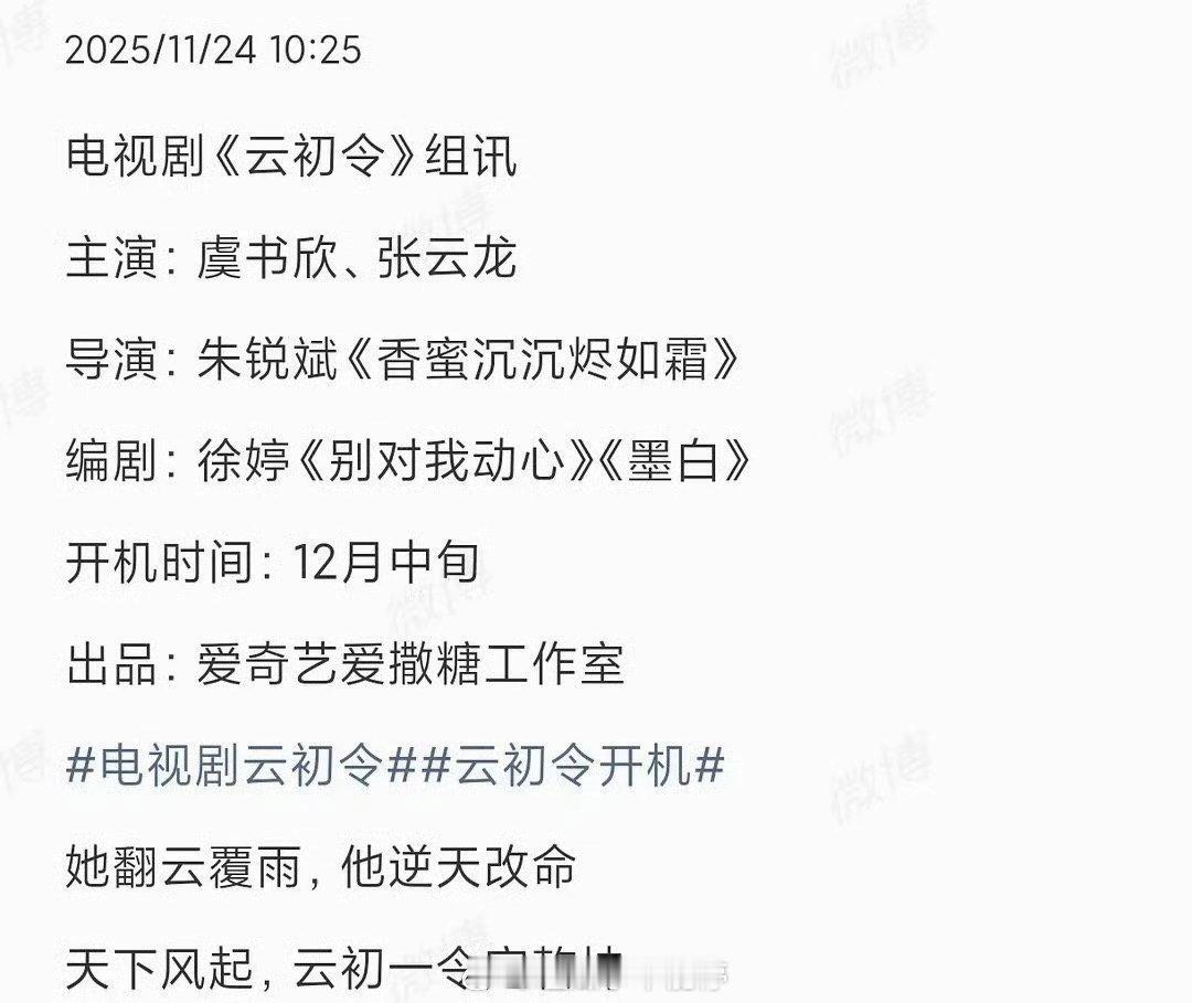 虞书欣张云龙《云初令》组讯,12月中旬开机 !