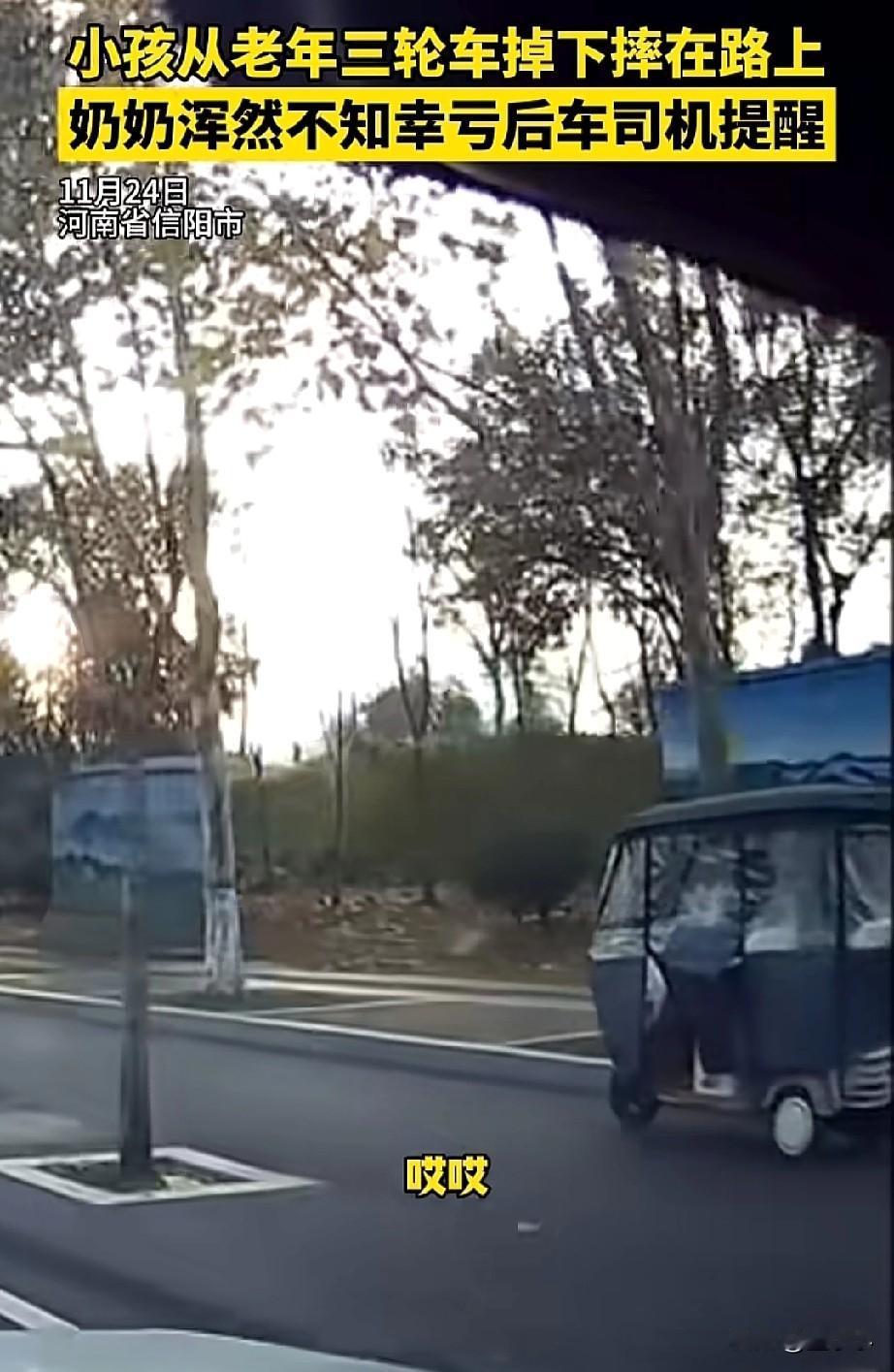 天呐!太吓人了!河南,孩子从三轮车上掉了下来,奶奶却浑然不知,骑车突突的跑,还好被后面的司机大哥给叫住了,这才停下。 廖先生开车正在行驶中,在拐弯处,前面一个三轮车上突然就掉下来一个孩子,不过好在反应过快,打了一点方向盘没有碰倒孩子。 更离谱的是,孩子的家长却浑然不知,并没有停下,廖先生看到后,立马就靠边并且大声的喊道,小孩掉了,小孩掉了,车上的家长听到后,这才停下了车。 从视频中看到,这一幕真的太危险了,廖先生要是稍微靠右点,或者孩子掉下来时候往左滚一点,那就是坑了车主了,害了孩子,毕竟这突发状况,紧急刹车也不一定能保证孩子是安全的。 所以,让老人送孩子的家长,一定要多嘱咐几遍,有的老年人在路上骑电动车那可真可怕,要么闯红灯,要么转弯也不观察直接就转弯,就连后面按喇叭,人家就跟没听见一样。