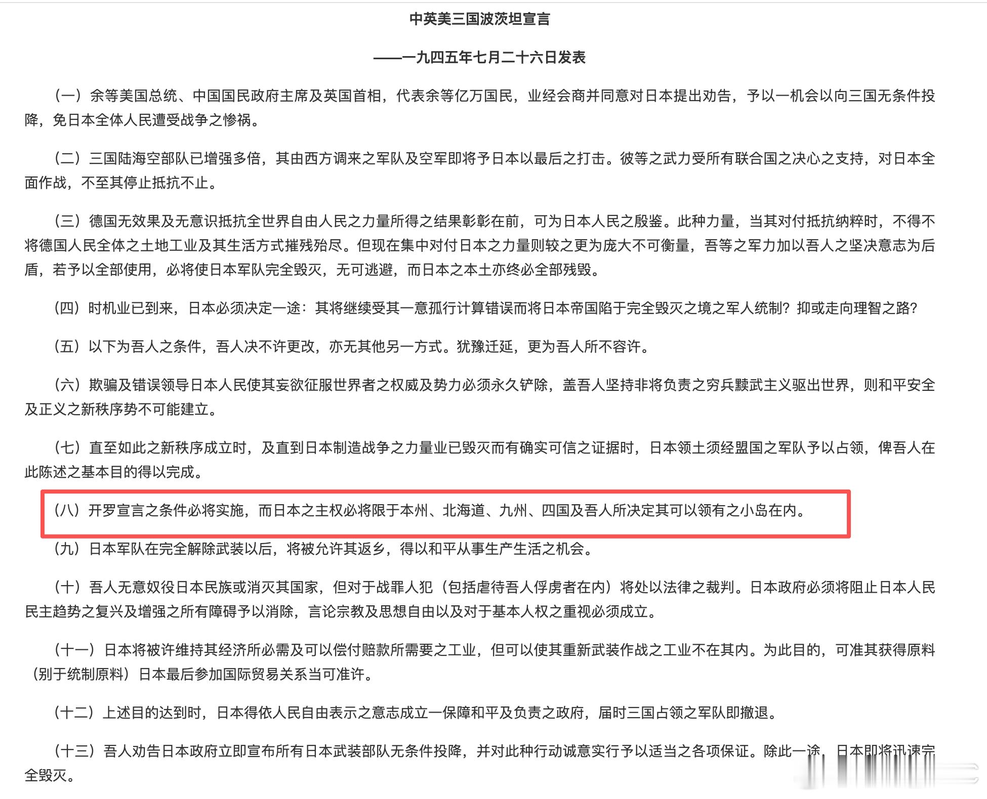 《波茨坦公告》第八条的立场是啥?查了一下:“日本之主权必将限于本州、北海道、九州、四国及吾人所决定其可以领有之小岛在内。” 嗯....没包括琉球
