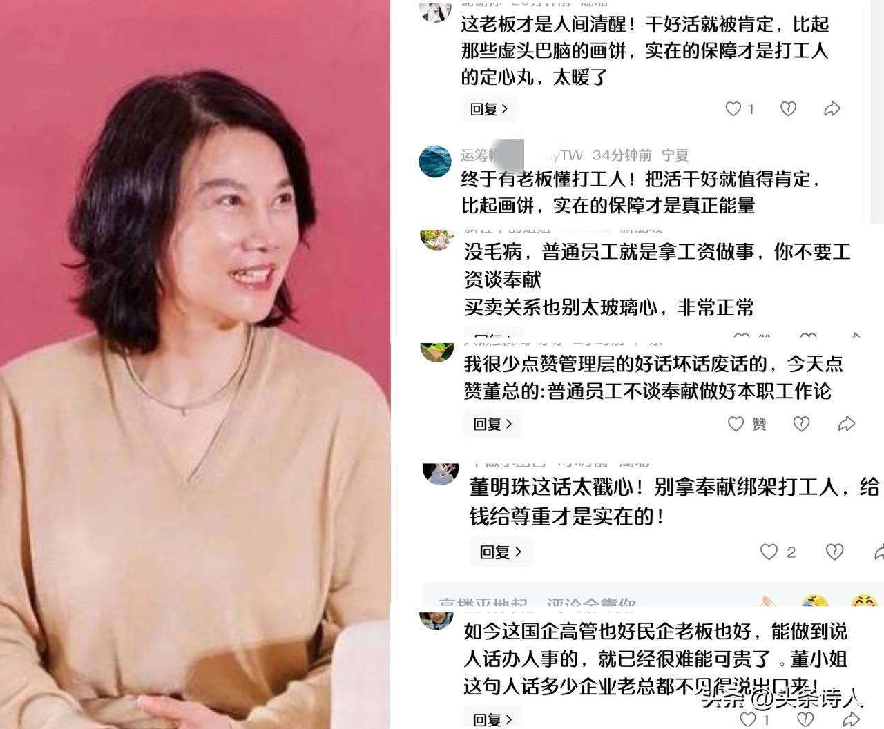 董明珠:普通员工不用谈奉献,把活干好就挺牛。 👍此话一出,得到了广大职场网友的共情 网友们→“这话太戳心!别拿奉献绑架打工人,给钱、给尊重才是实在的!” 董明珠,在近日的采访中谈及“员工奉献话”题时,大方表示: 🔹企业不应要求普通员工谈奉献,奉献是领导干部的责任。 🔹普通员工做好本职工作,不违规违纪,不伤害企业利益,并尊重他人是首要职责。 董明珠的观点,得到了网友的一致好评点赞,评论圈好评炸锅: →这才是企业家获得“员工共情”的正确理念; →这老板才是人间清醒!干好活就被肯定,比起那些虚头巴脑的画饼,实在的保障才是打工人的定心丸,太暖了💘 →我很少点赞管理层的好话坏话废话的,今天点赞董总:普通员工不谈奉献做好本职工作论; →终于有老板懂打工人!把活干好就值得肯定,比起画饼,实在的保障才是真,正能量👍 …… 你认同董明珠关于员工奉献说法吗??