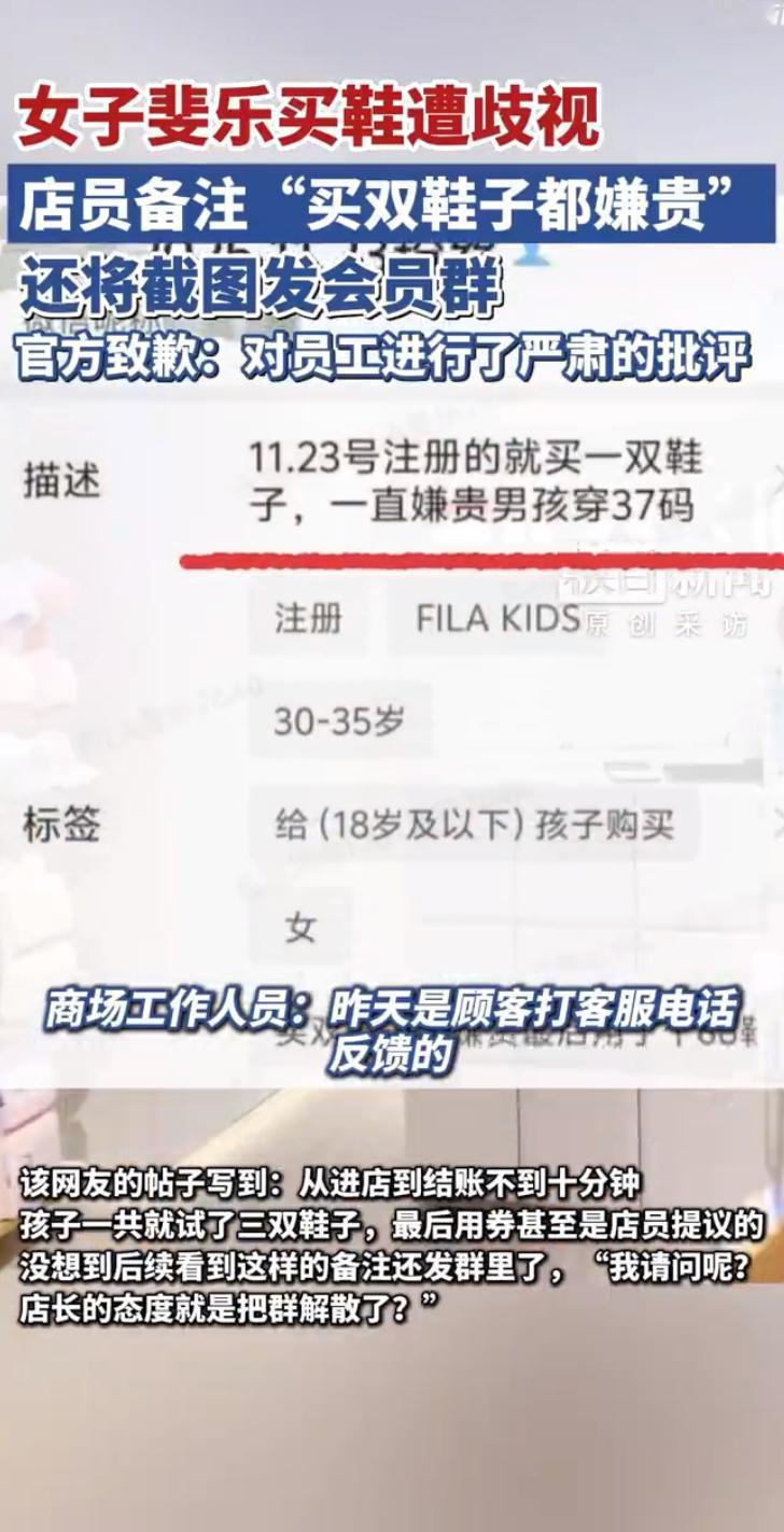 郑州一位妈妈在斐乐儿童店给孩子买鞋的经历,让无数人倒吸一口凉气。从进店到结账不到十分钟,孩子试了三双鞋,最后用店员推荐的优惠券付款,本是一次再普通不过的购物,却因一条备注掀起轩然大波。这位妈妈偶然发现,店员在微信客户页面给她打上了“买双鞋子都嫌贵”的标签,还把截图发到了会员群。群里其他顾客的类似备注也被曝光,比如“绑定的奥莱,不能用,结果让她老公又注册一下”。原本以为是段子,没想到真有人把对顾客的“吐槽”当成内部梗传播,这操作着实让人寒心。 这件事表面看是店员素质问题,内里却戳中了消费社会的敏感神经。我们去商场买东西,图的是明码标价、童叟无欺,谁也不希望被店员暗地里评头论足。更讽刺的是,这位妈妈根本没“墨迹”——试鞋数量合理,还用了店员提议的优惠券,结果却被贴上“嫌贵”的标签。店员的逻辑很魔幻:顾客没盲目消费就是“抠门”?没被推销套路就是“难缠”?这种把销售压力转嫁到顾客身上的做法,本质上是对消费者尊严的践踏。 更值得警惕的是,这种“标签化”消费行为正在成为潜规则。很多品牌会用CRM系统记录顾客偏好,比如尺码、常购品类,本意是提升服务精准度,但一旦变成“嫌贵”“难搞”的负面评价,就变了味。就像群里其他顾客被备注“绑定奥莱”(指奥特莱斯渠道),暗含“占便宜”的贬义,这种居高临下的评判,把平等的买卖关系变成了“施舍与被施舍”。当商家用标签把顾客分成三六九等,消费体验就失去了最基本的尊重。 斐乐官方的反应倒是挺快,当天就发声明道歉,说“对存在失当行为的员工进行了严肃批评”,还承诺“改进服务水平”。但公众要的不是危机公关,而是真正把顾客当“人”而不是“韭菜”的态度。有网友翻出类似经历:买衣服被店员私下嘲笑“身材差”,买手机被备注“不懂行好忽悠”……这些“看不见的标签”像针一样扎人,因为它暴露了一个真相:在某些商家眼里,顾客的消费能力直接等同于人格价值。 这件事也给所有消费者提了个醒:你的购物行为可能正在被“打分”。从进店时的衣着判断消费力,从试穿次数推测购买意愿,甚至从砍价力度评估“性价比”……当消费变成一场隐形的审判,我们该如何自保?其实很简单:用脚投票。遇到不尊重顾客的商家,果断转身离开;看到类似“标签门”曝光,主动声援维权者。毕竟,市场是商家的考场,消费者手里的钱包就是评分器。 说到底,“买双鞋子都嫌贵”刺痛的不是钱包,而是被物化的失落感。我们希望走进一家店,听到的是“需要什么帮助”,而不是心里默念的“这人买不起”;期待买到的是合心意的商品,而不是被贴上标签的“客户档案”。当商家学会把“尊重”写进服务手册,消费者才能真正挺直腰杆说:我花钱,我骄傲。 你有没有遇到过被商家“区别对待”的经历?对这种“标签式服务”怎么看?评论区聊聊,让尊重成为消费的底线。 (案例来源:极目新闻)
