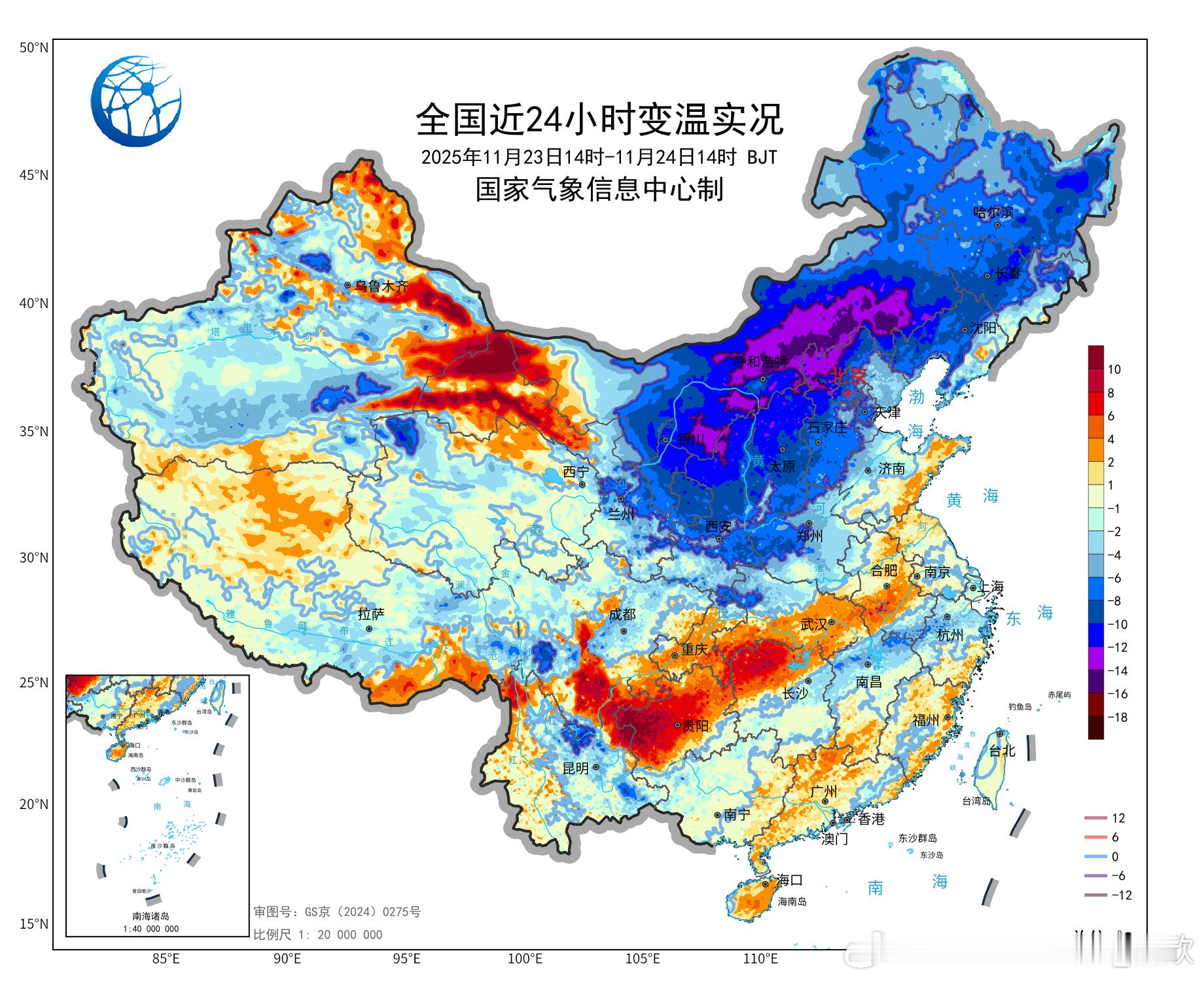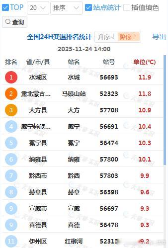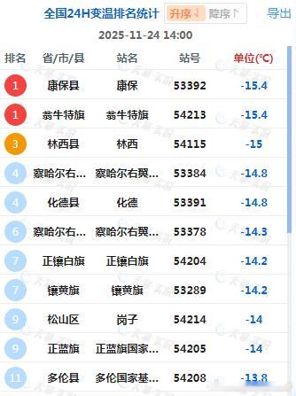 【气温波动】今天冷空气继续东移,内蒙古河套到中部一带、宁夏北部、陕西北部、山西北部、河北北部、辽宁西部等地降温超10℃。河北康保和内蒙古翁牛特旗,降温都是15.4℃、内蒙古林西降15℃,为14时降温前3站点。而冷空气离开或者天空放晴,导致甘肃西部、四川南部、贵州西部多地升温8℃以上,贵州水城升11.9℃、甘肃马鬃山升11.8℃、贵州大方升10.9℃、威宁升10.4℃、四川冕宁升10.3℃,为14时升温前5站点。