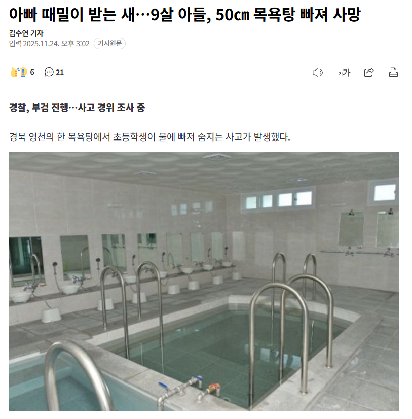 【韩国9岁男童在50厘米深澡堂浴池溺亡,父亲当时正搓澡】 据庆北消防本部等机构24日透露,前一天下午4点58分左右,接到报警称,在永川市瑞山洞的一家澡堂,一名9岁男童A某溺水。赶到的急救人员将已处于心脏停跳状态的A某送往医院,但最终不治身亡。据悉,事故发生在A某的父亲暂时离开去接受搓澡服务(未看护孩子)期间。发生事故的浴池深度经确认约为50厘米。据称,A某平时没有基础疾病。警方正根据目击者陈述和尸检结果,调查确切的死亡原因和事故经过。韩国温泉和公共澡堂的儿童溺水事故每年都在持续发生。此前在今年1月,庆北青道的一处温泉浴池中,也有一名5岁男童在1.1米深的水中溺水身亡。根据韩国疾病管理厅对2020年至2024年参与急诊室损伤患者深度调查的25家医院的数据进行分析的结果,因溺水事故前往急诊室的患者共有523名。按年龄划分,9岁以下儿童占比最高,达29.6%。事故发生频率在周末(周六20.1%,周日18.5%)较高,工作日中周五尤其高,达15.3%。发生地点主要是在海洋、江河等户外(46.1%),但在大众设施(澡堂、水上乐园等,30.2%)和运动设施(游泳池等,8.8%)也发生多起。疾病厅提醒,每年因溺水事故前往急诊室的患者虽仅占全体损伤患者的0.1%左右,但其中高达28.7%的患者死亡,死亡风险很高,因此遵守安全守则等最为重要。