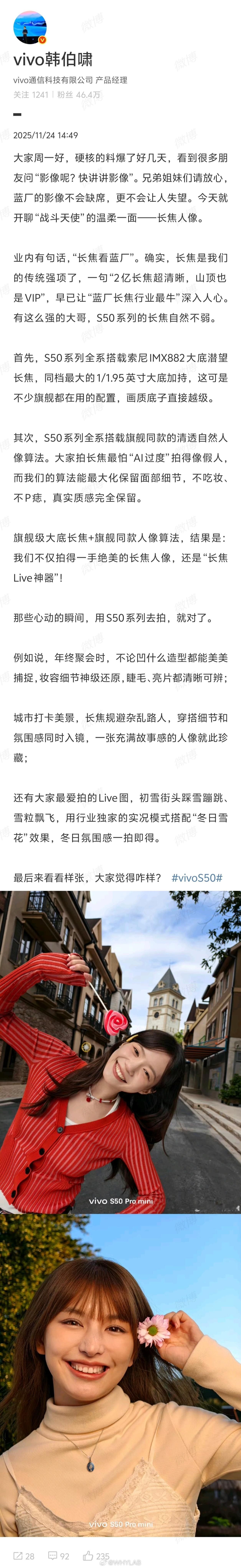 vivo S50 全系索尼 IMX882 大底潜望长焦,1/1.95 英寸大底,同档最大,标准版能有这规格已经很好了。