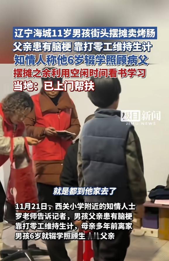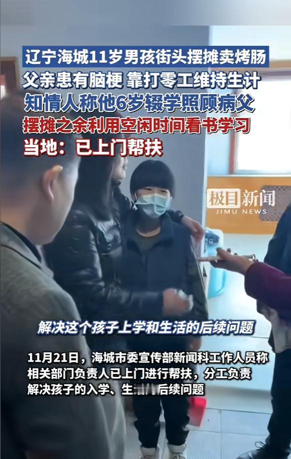 “看哭了!”11月21日,辽宁海城,一名11岁小男孩正在学校门口摆摊卖烤肠,据了解,他的父亲患有脑梗,平时靠打零工维持生计,小男孩为了照顾父亲,6岁就开始辍学将家里的重担扛了起来,只有在闲暇之余才有时间看书。网友:缺失的课谁来补? 在辽宁海城的某小学门口,有一个11岁的小男孩每天在这里卖烤肠,听着与他同龄小朋友的朗朗读书声,他只能羡慕地望着对他来说陌生不已的教学楼。 男孩叫熊猫,与父亲相依为命,因为父亲患上脑梗,只能干零活,微薄的收入根本难以维持生计,到熊猫6岁时,只能辍学照顾生病的父亲,小小的肩膀上扛起整个家庭的重担。 辍学之后,摆摊卖烤肠成了他的日常,本应坐在教室的美好时光就在照顾父亲和补贴家用的奔波中流逝,但熊猫从来没放弃对知识的渴望,在闲暇之余,他也会打开书本努力学习,希望有一天能够回到学校。 当地街道办得知后,立马安排工作人员上门帮扶,各方分工负责,重点解决熊猫入学和生活的后续问题,也在为熊猫父亲找适合他干的活计。 在学校门口摆摊的孩子,竟然错过了学校这么多年,困境儿童的保障需要家庭、社会与学校的协同发力,这样才不至于让一个孩子辍学5年才被发现。 孩子是祖国未来的花朵,是民族和社会未来的希望,每个孩子都应该有一个快乐的童年,有接受教育的权利,不让任何一个孩子在保护网中“漏网”,才是对童年的最好守护。 信息来源:《11岁男孩街头摆摊卖烤肠,知情人称他6岁辍学照顾病父,摆摊之余利用空闲时间看书学习,当地:已上门帮扶》极目新闻