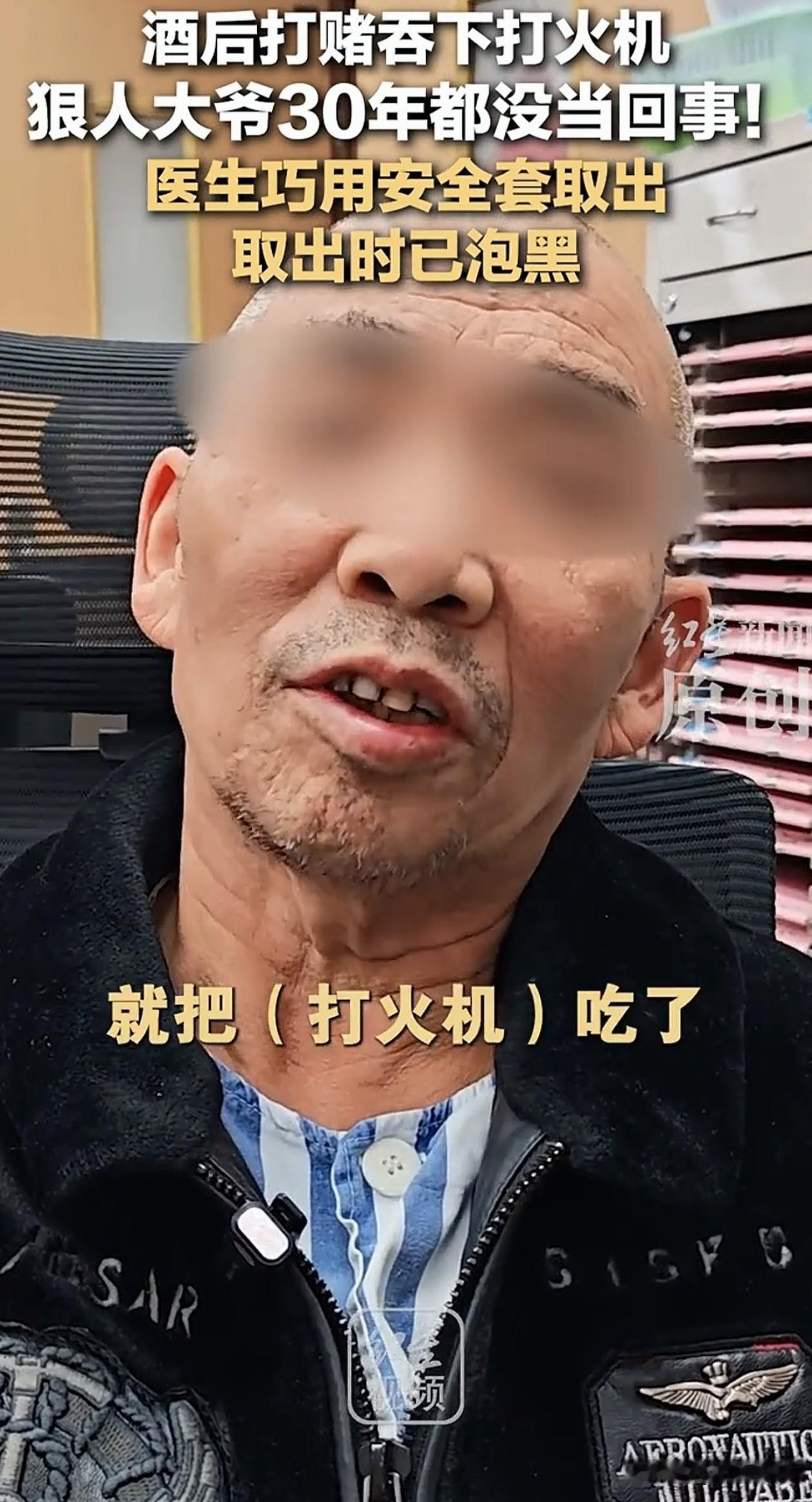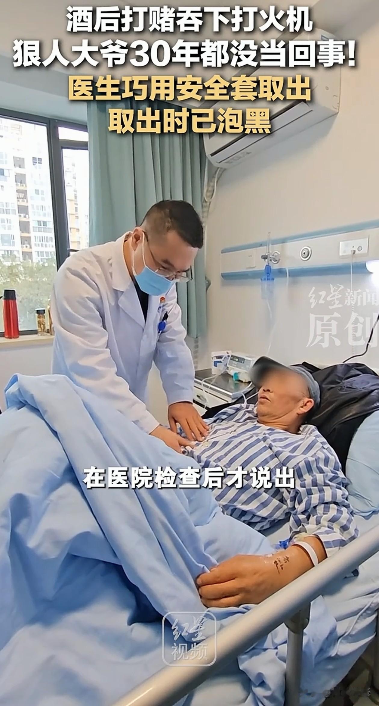 成都,一位大爷年轻时和朋友喝酒,酒后脑子一热,打赌吞下打火机,30年后才被发现,医生使用安全套巧妙将其取出。 67岁大爷年轻时和朋友一起喝酒,酒后他们起哄用桌子上的打火机打赌,大爷在酒精的作用下,和另一个人一起把打火机吞下去了。 酒醒后大爷没当回事,觉得会自然排出,而且之后的30多年里,只是偶尔腹痛,吃药就能缓解,便渐渐忘了这件事。 直到一个月前,大爷腹部持续胀痛,来到医院做检查,医生通过胃镜发现大爷胃里有个黑乎乎的东西,大爷才说出那是个打火机。 因为打火机表面光滑,普通钳子不好夹,于是医生灵机一动,拿了个安全套,通过胃镜送到胃里撑开,把打火机稳稳套住,最后成功取出。整个过程只用了20分钟。 有网友调侃这是硬核赌约,让打火机在胃里“住”了半辈子,大爷的酒量和胆量都够传奇。 也有网友表示,自己年轻时也爱跟朋友打赌逞强,现在想想觉得太幼稚了,健康真的经不起折腾。 所以说,遇事别冲动,面子不如身子骨,稳稳当当最重要。