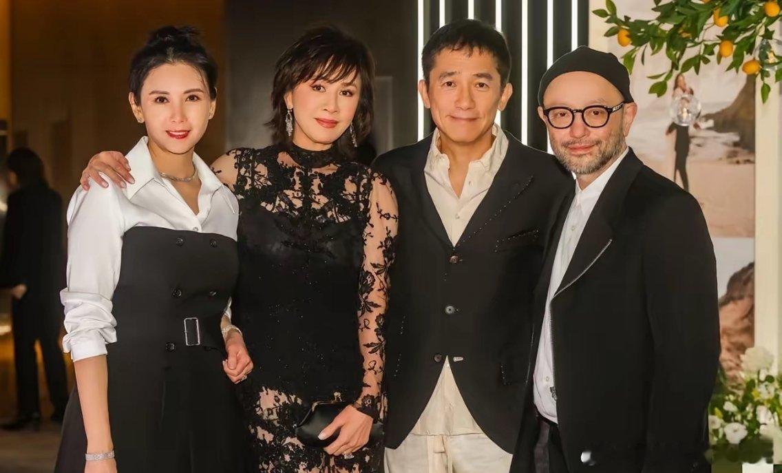 时尚女王刘嘉玲和老公梁朝伟一起出席朋友孩子的婚礼,一袭黑色透视蕾丝裙光彩夺目。久未露脸的邱淑贞和老公沈嘉伟一起和嘉玲姐夫妻俩人同框合影特别养眼。今年都57岁的邱淑贞盘着头发,身穿黑白拼接的裙子,看上去很年轻像40岁的人,依旧漂亮。反观老公戴着黑色帽子和黑框眼镜,胡子拉碴像大爷似的,一旁边62岁的梁朝伟西装革履倒是年轻帅气和嘉玲姐好般配。当天来参加婚礼的明星很多,台湾来的蓝色头发的小燕姐,张艾嘉,张清芳等,她们都精心打扮,难得聚在一起特别的开心。