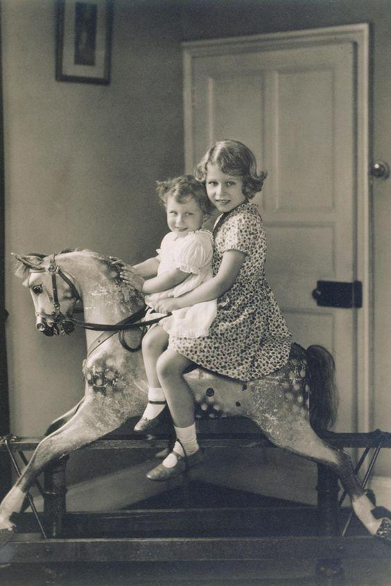 1936年,年幼的伊丽莎白公主和妹妹玛格丽特公主一同在家里骑木马! 伊丽莎白女王从小和妹妹玛格丽特公主的感情就相当之好,可以说在高高的王宫围墙内,姐妹俩彼此陪伴着对方成长,彼此依赖。 那时的伊丽莎白女王还只是约克家的公主,还不是王储,自由自在和妹妹玛格丽特享受轻松又幸福的童年。 10岁的伊丽莎白公主怀中搂抱着6岁的玛格丽特公主,两人骑在小木马上,一起笑着望向镜头,那时的姐妹俩表情和长相都好像!