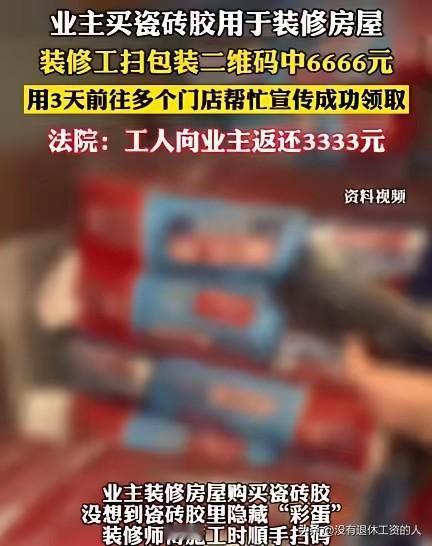这笔钱到底归谁? 湖北一个贴砖的泥工师傅,看到主人买回来的瓷砖上有一个二维码,好奇就用手机去扫了一下。 没想到,直接扫出来了6666元的现金奖励。原来以为又是什么诈骗的套路,这个泥工师傅赶紧删除了页面,想到天上哪里会掉馅饼,这个馅饼又正好砸在自己头上。 哪里想到,仅仅过了几分钟,卖瓷砖的品牌客服就打来了电话,报出了他买瓷砖的门店和姓名,还发来了中奖的凭证。 拿着这个凭证就可以领到6666元的奖金。这一次不是骗局,是实实在在的中了大奖。 没想到过了半个月,房东得知了泥工师傅中奖的消息,找到师傅,要求他退还奖金。 房东说:瓷砖是我花钱买的,那中了奖肯定也应该是我的,你不过只是一个干活的师傅。 泥工师傅当然不愿意退,这吃到嘴里的肥肉哪里有吐出来的道理? 自己不去扫瓷砖上的二维码,也就没有中奖的机会。 法院最后裁定:泥工师傅退还3333元的奖金给房东。 民法典有明确规定:所有权人对自己的不动产或者动产,依法享有占有,使用,收益和处分的权力。 瓷砖是房东买来的,那包装上的二维码作为商品的附属物,收益自然归房东所有。 但这个收益权是贴砖师傅扫码以后得来了,所以也有收益。 也就是说:这笔奖金一半算房东的所有权收益,一半算贴砖师傅的运气回报,皆大欢喜。 你们觉得,法院的判决合理吗? 瓷砖中奖案 瓷砖空鼓诈骗