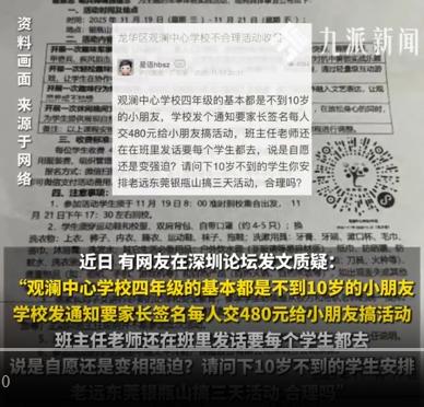 家长质疑小学要求交480元参加活动:费用包括食宿等,班主任老师还要每个学生都去,说是自愿还是变相强迫? 以后学校里面的所有活动,严禁使用自愿一次词,要么就是没有要么必须,不要总是打着自愿的词语,做着必须的事情,现在这个词语在学校里边,就像游走在法律的边缘,被这个词语被学校方面利用的淋漓尽致。 挂国字都有可以贪,诈项目,贪多了孝敬一些给上级,上级顶着,贪少了,上级没分到,家长又举报,上级就责令退款,这么多年来,学校就靠贪学生的钱,一直没断过。 这个挂着学习名义的活动,费用不应该学校出吗?你你们不能既要又要,拿着家长的钱给你们学校脸上贴金,搞得这个活动还写到你们校志上,说某年某月学校组织学生去某某地方学习,然后然后成功之类的,别人出钱,你脸张光,要点脸不行吗?