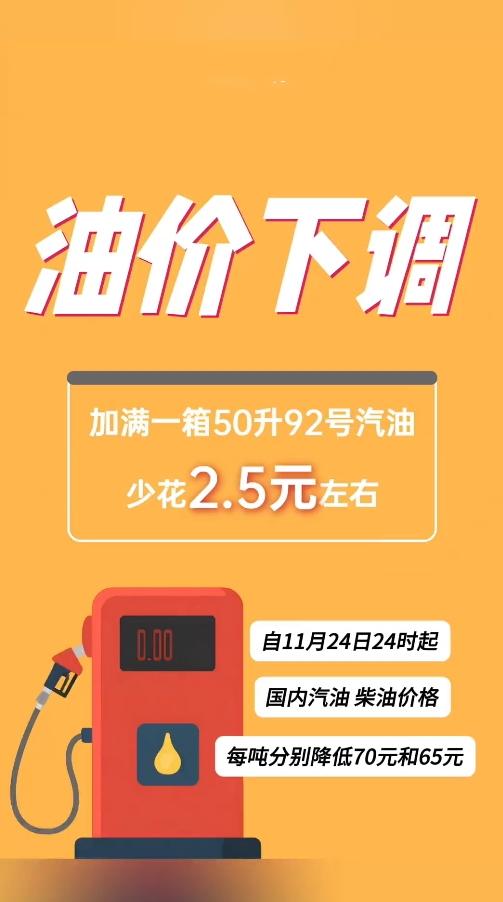 油价今晚真的“跳水”啦!11月24日24时起,国内成品油迎来年内第13次调价,汽油每吨下调70元,柴油每吨下调65元。折算下来,九十二号汽油每升便宜五分,加满一箱五十升,能省个两块五左右。 调价后,北京九十二号汽油回到“七元时代”,每升七点九八元;上海九十五号汽油降至八点五二元。物流行业先尝到甜头,大货车加满一箱油能省三十元。专家分析,这次降价主要是因为国际原油价格震荡回落,短期内可能还会小幅波动。 网友们乐开了花,调侃说:“这波羊毛必须薅!”不少车主已经连夜排队加油,加油站工作人员表示,零点前的顾客明显多了起来。能源分析师建议,大家可以留意下一轮调价窗口,合理安排加油时间。 油价一降,大家都能省点小钱,积少成多,也是一笔“看得见的幸福”。你今晚准备去加油吗?点个赞接住油价福利,评论区分享你的省油小妙招,顺手转给朋友,让大家一起省钱~ 油价今晚下调 声明:如有侵权,请联系删除!