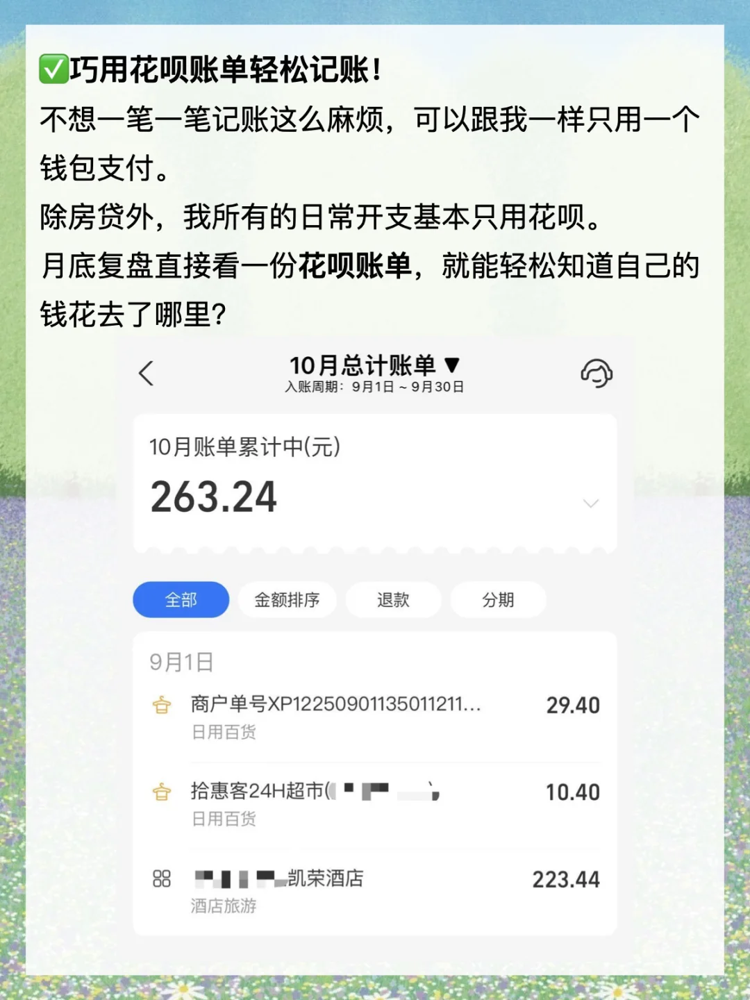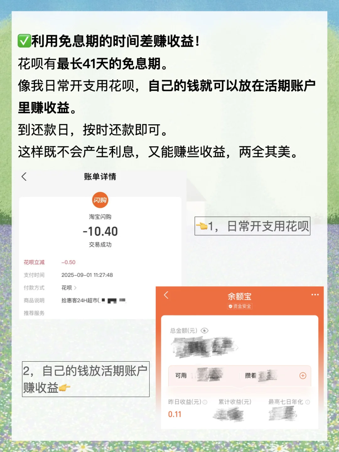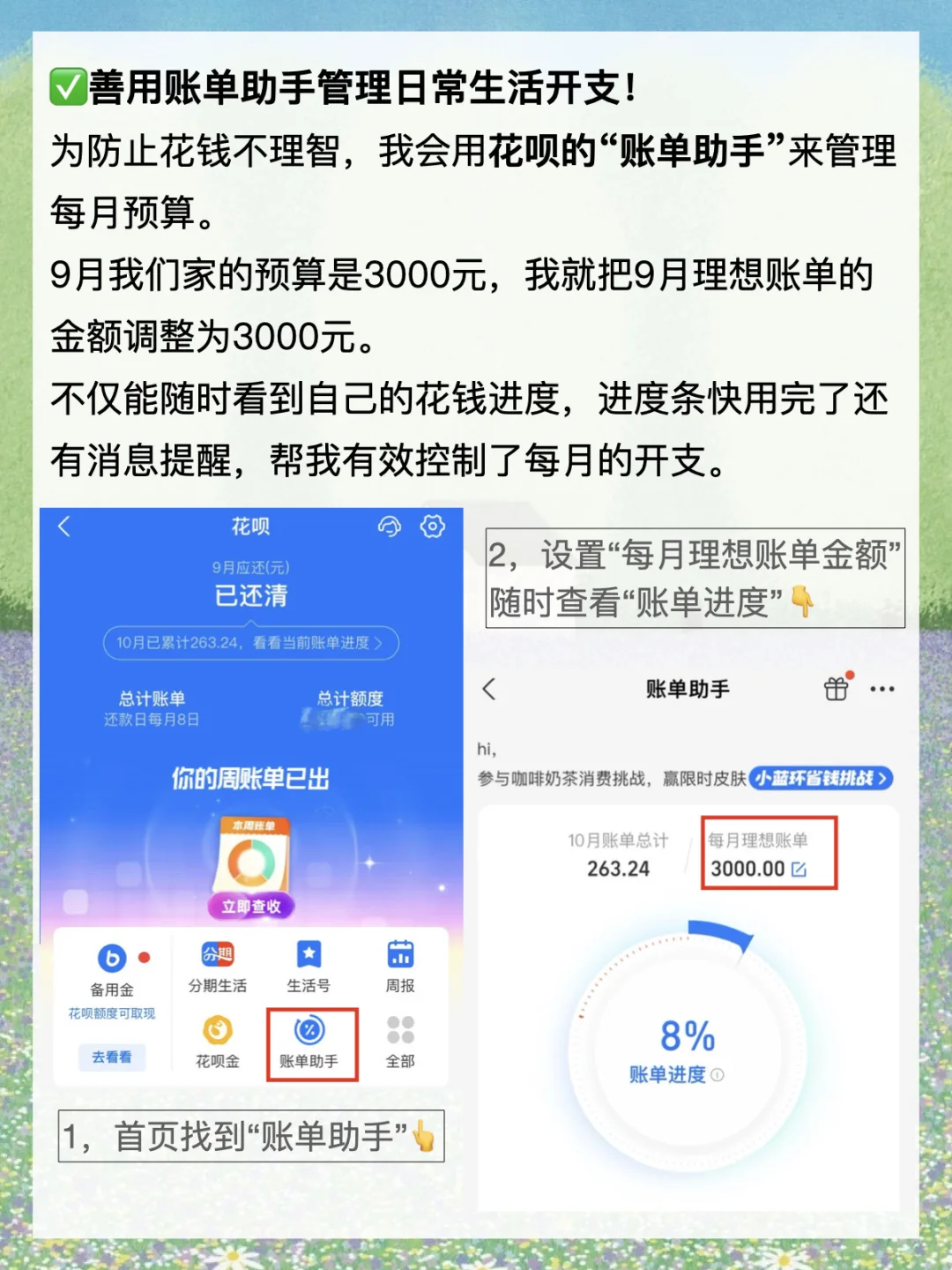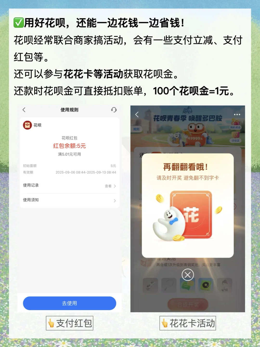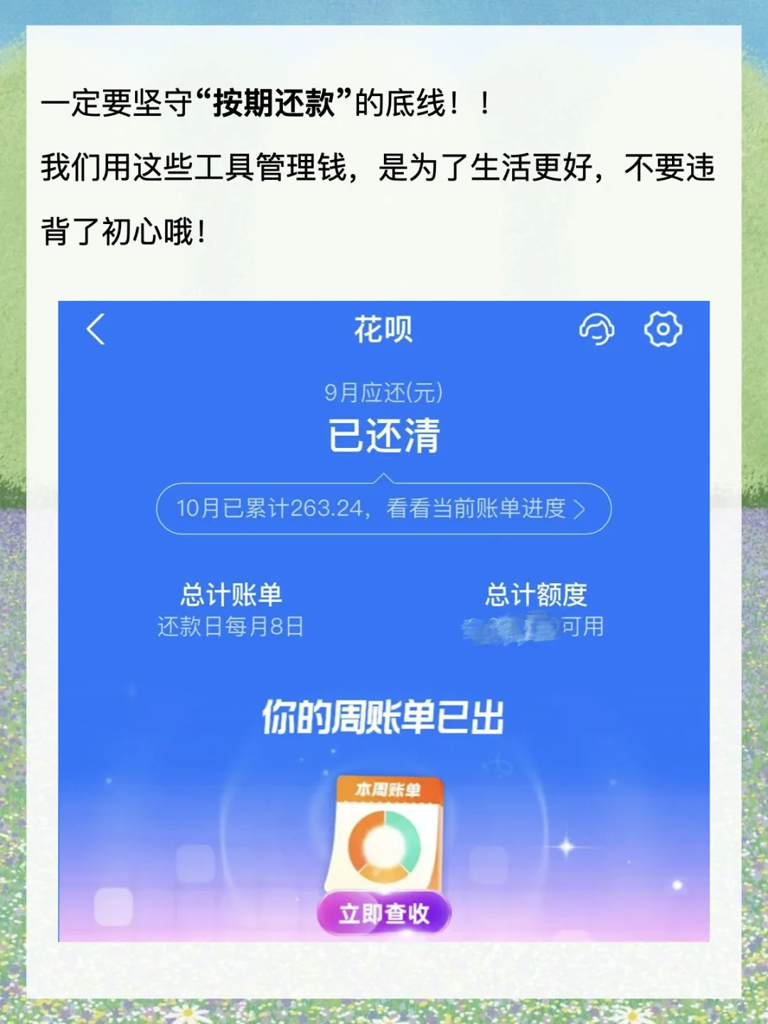 · 作为一个存钱人,我并没有完全放弃使用信用卡和花呗这类工具。 相反,我觉得信贷工具如花呗,并不只是一个让你花钱的东西,它还可以是一个很好用的管钱工具。 今天就来分享一下,我是如何利用这个工具来提速存钱的? · 1️⃣巧用花呗账单轻松记账! 存钱的第一步是,通过记账,了解自己的钱花去了哪里? 经常有朋友跟我说,每天记账好难坚持啊。 尤其是一些零零碎碎的开支,很容易想不起来。 所以,我养成了只用一个钱包支付的习惯。 除房贷外,我所有的日常开支基本只用花呗。 这样的话,每一笔开支都有迹可循,月底复盘直接看一份花呗账单就可以了。 省去了很多麻烦,又能轻松知道自己的钱花去了哪里? · 2️⃣善用账单助手管理日常生活开支! 存钱第二步,花钱账户和存钱账户要充分隔离开来。 但我又不想开那么多银行卡,我就把花呗当成日常开支账户来使用。 像买菜、买水果、交话费、坐公交等等,直接用花呗支出。 为了防止自己不理智,乱花钱,每个月我都会提前做好开支预算。 比如我们家9月的预算是3000元,那我就会在“账单助手”里把每月理想账单的额度调成3000元。 这样我就能随时看到自己的花钱进度,做到心中有数。 进度条快用完时,还会有消息提醒我,接下来要稍微勒紧一下裤腰带。 这个功能挺管用的,让我每个月的花销都能控制在预算范围前后。 · 3️⃣利用免息期的时间差赚收益! 存钱第三步,多赚钱,再小的钱也不能放过。 除了通过自己的才华技能去赚钱,我们还可以通过钱生钱。 花呗和信用卡一样,有最长41天的免息期。 像我的话,日常开支用花呗,自己的钱就可以存在活期账户里赚收益。 到还款日那天,再按时还款。 这样既不会产生利息,又能赚些收益,两全其美哦。 · 4️⃣用好花呗,还能一边花钱一边省钱! 存钱第四步,节俭不丢人! 像花呗就经常联合商家搞活动,会有一些支付立减券、支付红包等。 反正都是必须要花的钱,能省一笔是一笔啊! 我们还可以通过花花卡等活动获取花呗金, 还款时花呗金是可以直接抵扣账单的,100个花呗金=1元。 这不又省钱了。 · 最后再啰嗦两句,一定要坚守“按期还款”这个底线。 我们用这些工具管理钱,是为了生活更好,可不要违背了初心哦。