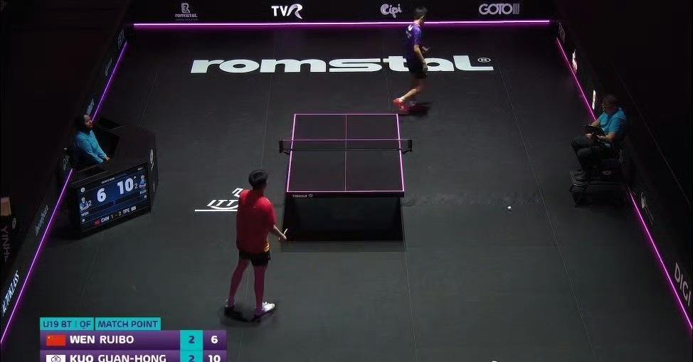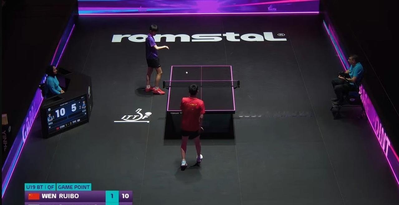 吓死我吧, 这第四盘第四局温瑞博🇨🇳11-5拿下中国台北新星郭冠宏! 两人大比分2-2平! 前三局温瑞博11-9,11-13,4-11郭冠宏, 这关键的第四局,挽救了2025世界青少年乒乓球锦标赛U19男团1/4决赛中的🇨🇳中国男团,目前中国男团1-2暂时落后于中国台北男团! 唉,这么快第五局就结束了,这一局温瑞博6-11输了郭冠宏! 看来全运会上小温累惨了,多点体谅吧。他们也拼尽全力了。 最终赛果:🇨🇳中国男团1-3输了中国台北男团,这也是中国男团首次没拿到奖牌。