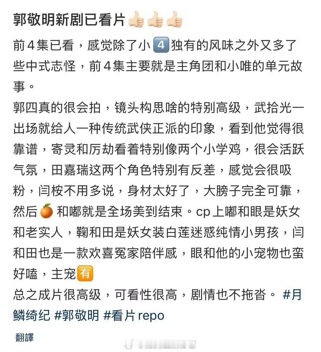 《月麟绮纪》的repo,鞠婧祎、曾舜晞、陈都灵、田嘉瑞主演的那部,露芜衣正片比路透还好看,非常期待鞠婧祎了。