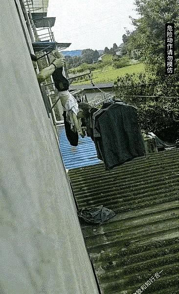 男子晾晒短裤被风吹到楼下棚顶。 他把三岁儿子两条腿提起,头朝下,指挥儿子把短裤取