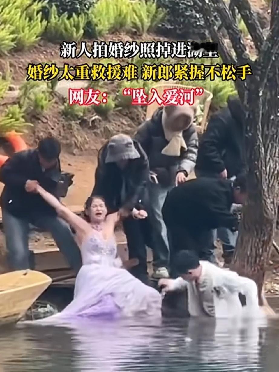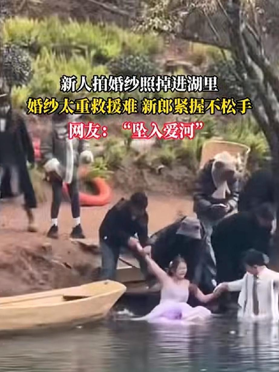 一对新人在湖边拍婚纱照时,不慎掉进水里,湖中的新郎一人无力施救自己的爱人,幸亏路过的几名游客及时赶到,拉着新娘的胳膊,尽力往岸上托,新郎则紧握不松手,由于新娘穿的婚纱太重,救援难度挺大,几名游客拼尽全力总算把新娘托上了岸,看着新人狼狈的样子,真是让人哭笑不得! 网友:坠入爱河!难道是这么来的?要感谢几名游客把一对新人救上岸!此事,给大家提个醒,拍婚纱照一定要远离水边,以防落水发生意外!